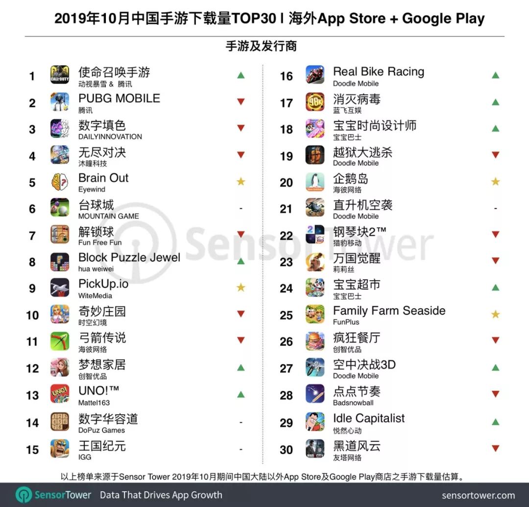 Sensor Tower 最新数据显示,2019年10月期间中国手游产品在海外市场下载量排名TOP30。本期亮点:《使命召唤手游》取代《PUBG MOBILE》夺冠,海彼新游《企鹅岛》空降榜单第20名,多款游戏新入围榜单。