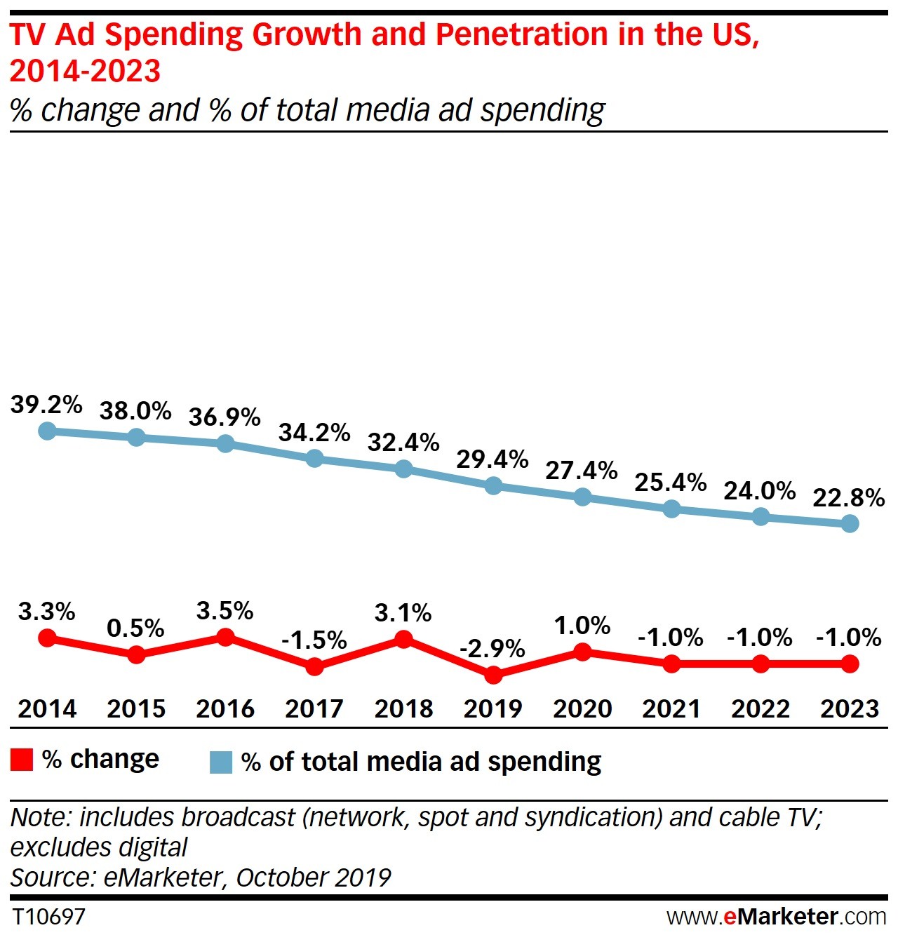 由于政治广告和2020年奥运会,明年的电视支出将小幅增长(1%)。但这种增长将是短暂的,因为此后每年电视支出都将呈下降趋势。