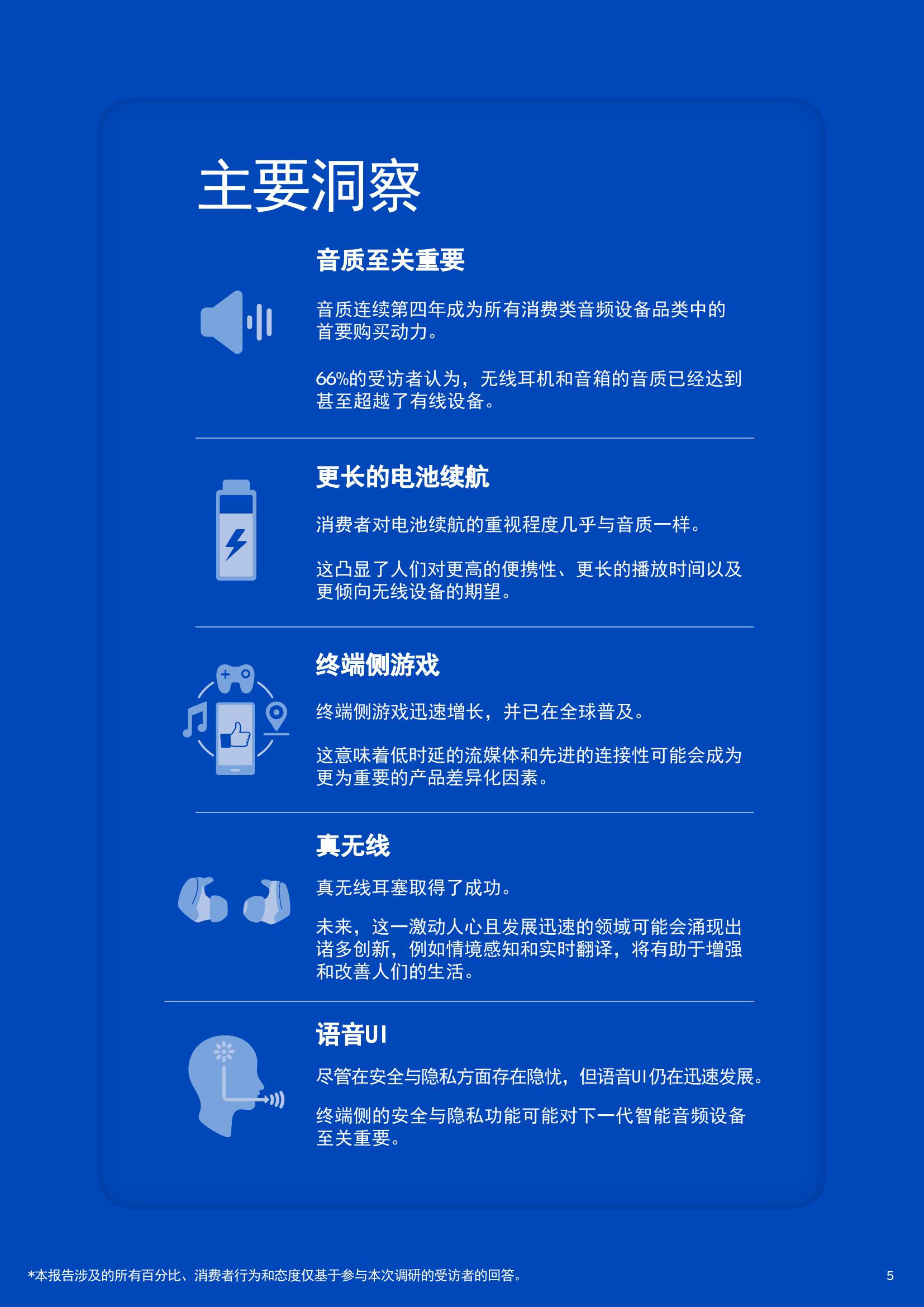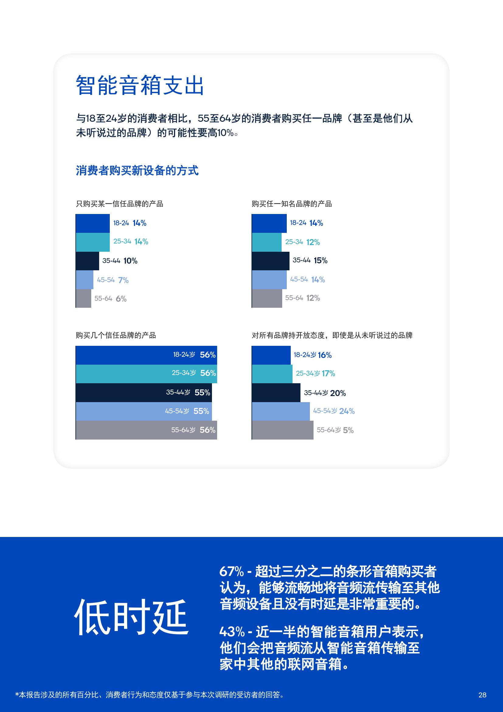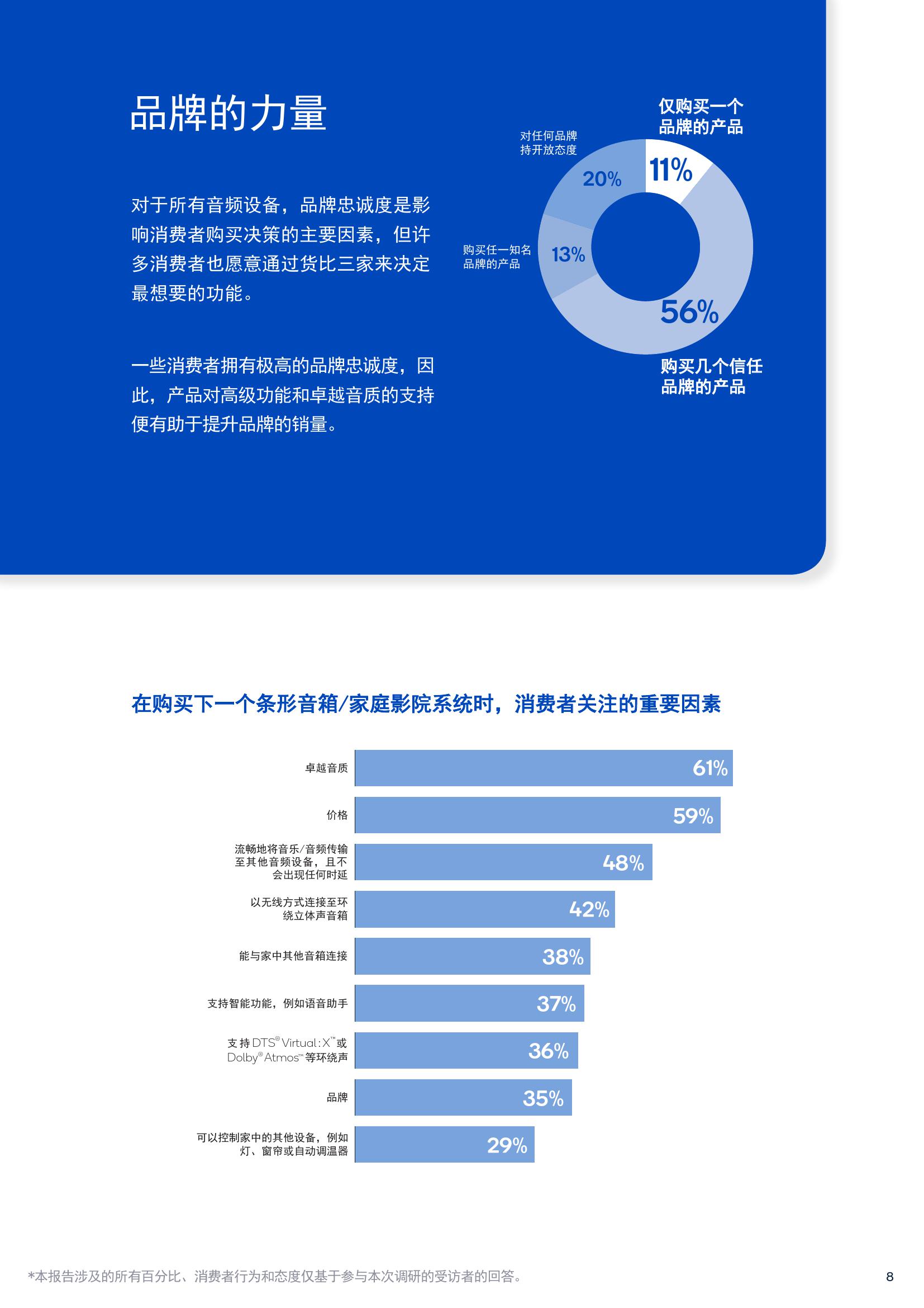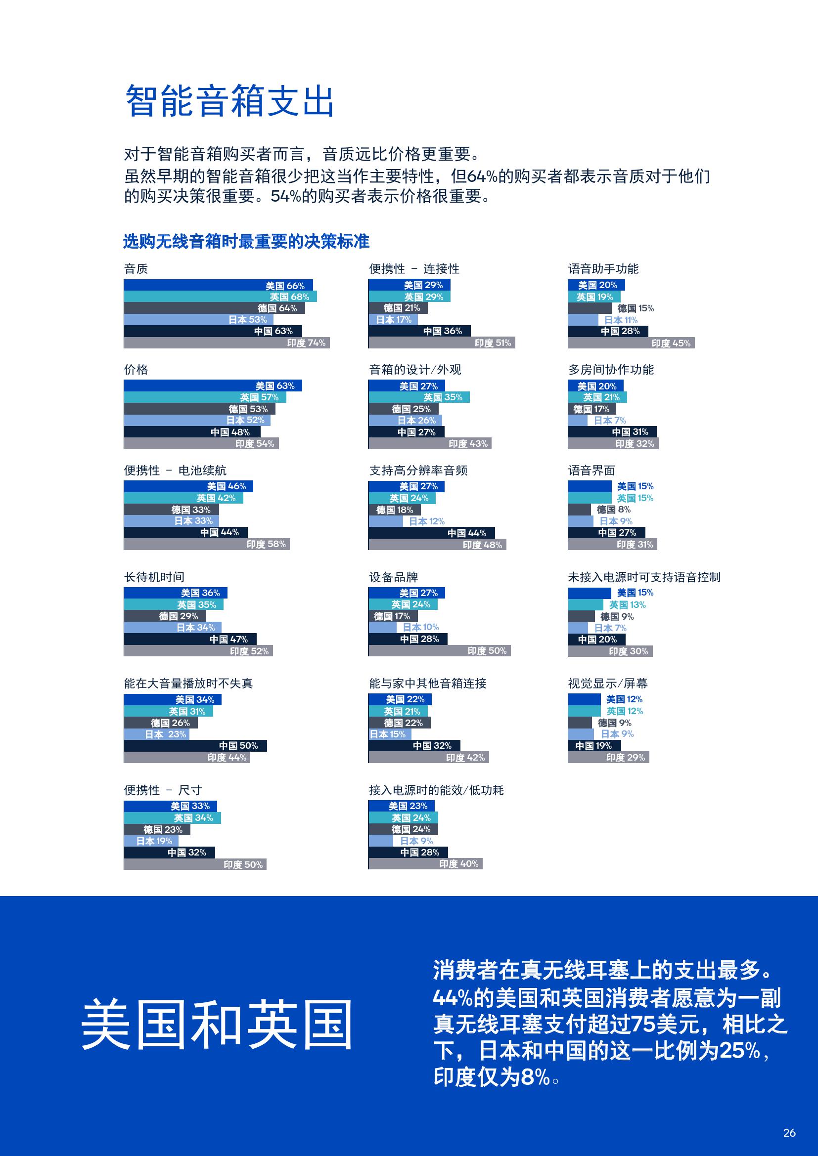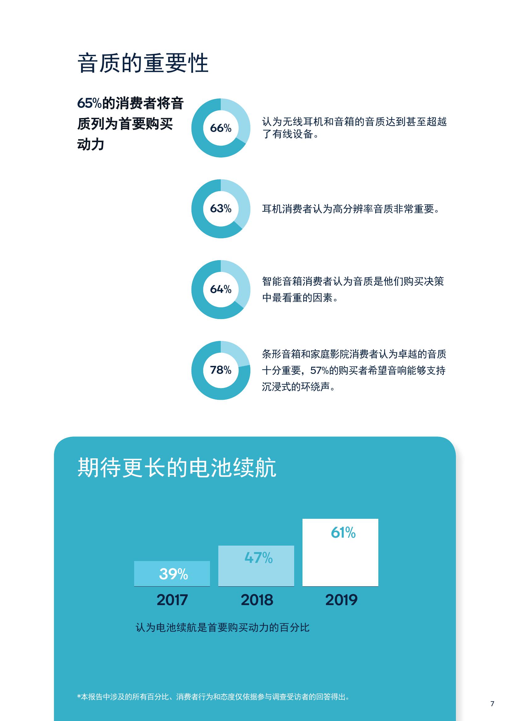 报告中有63%的耳机购买者表示高分辨率音质十分重要,还有64%的智能音箱消费者表示音质是做出购买决策时最看重的因素,78%的条形音箱和家庭影院购买者也表示卓越的音质非常重要。