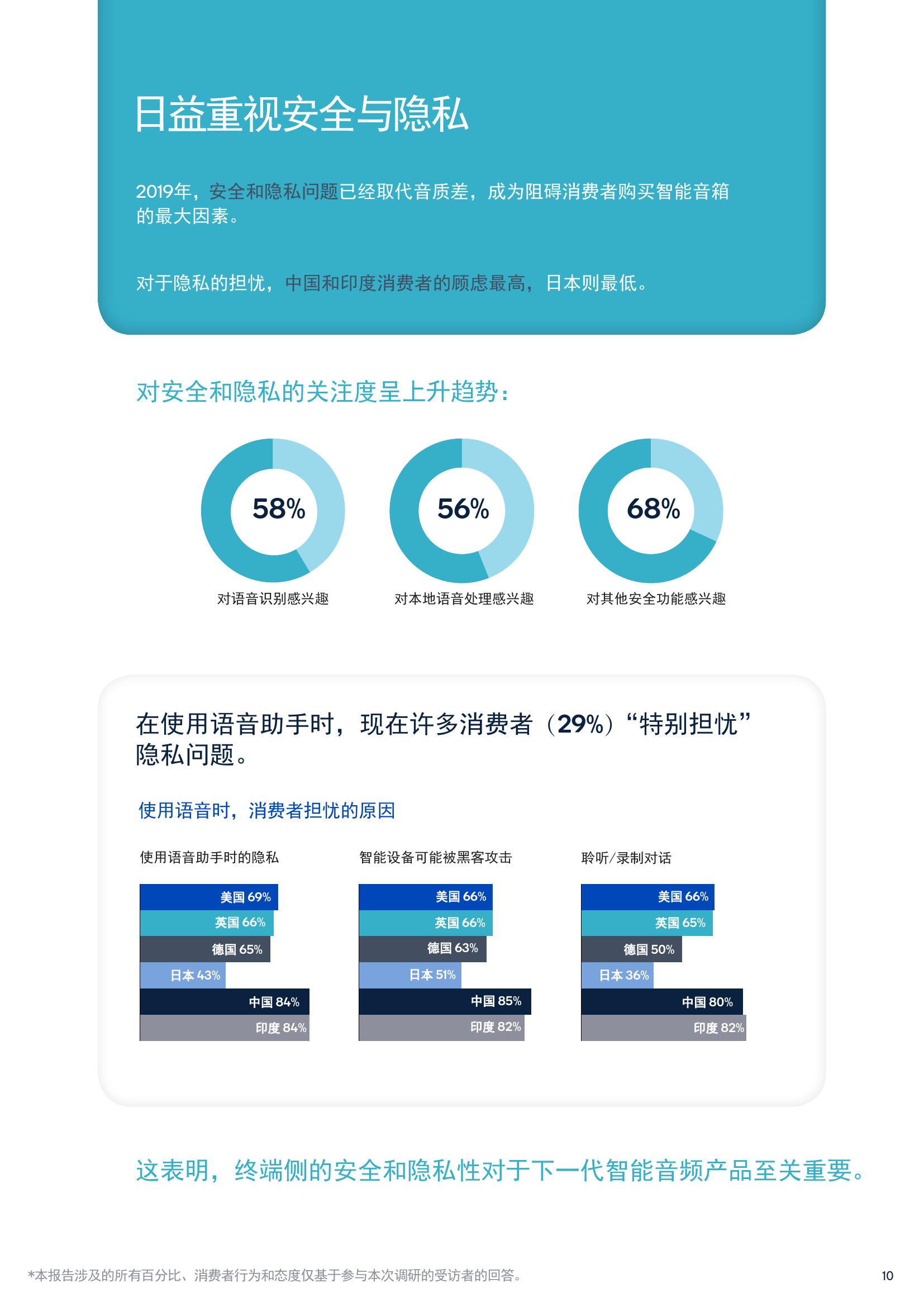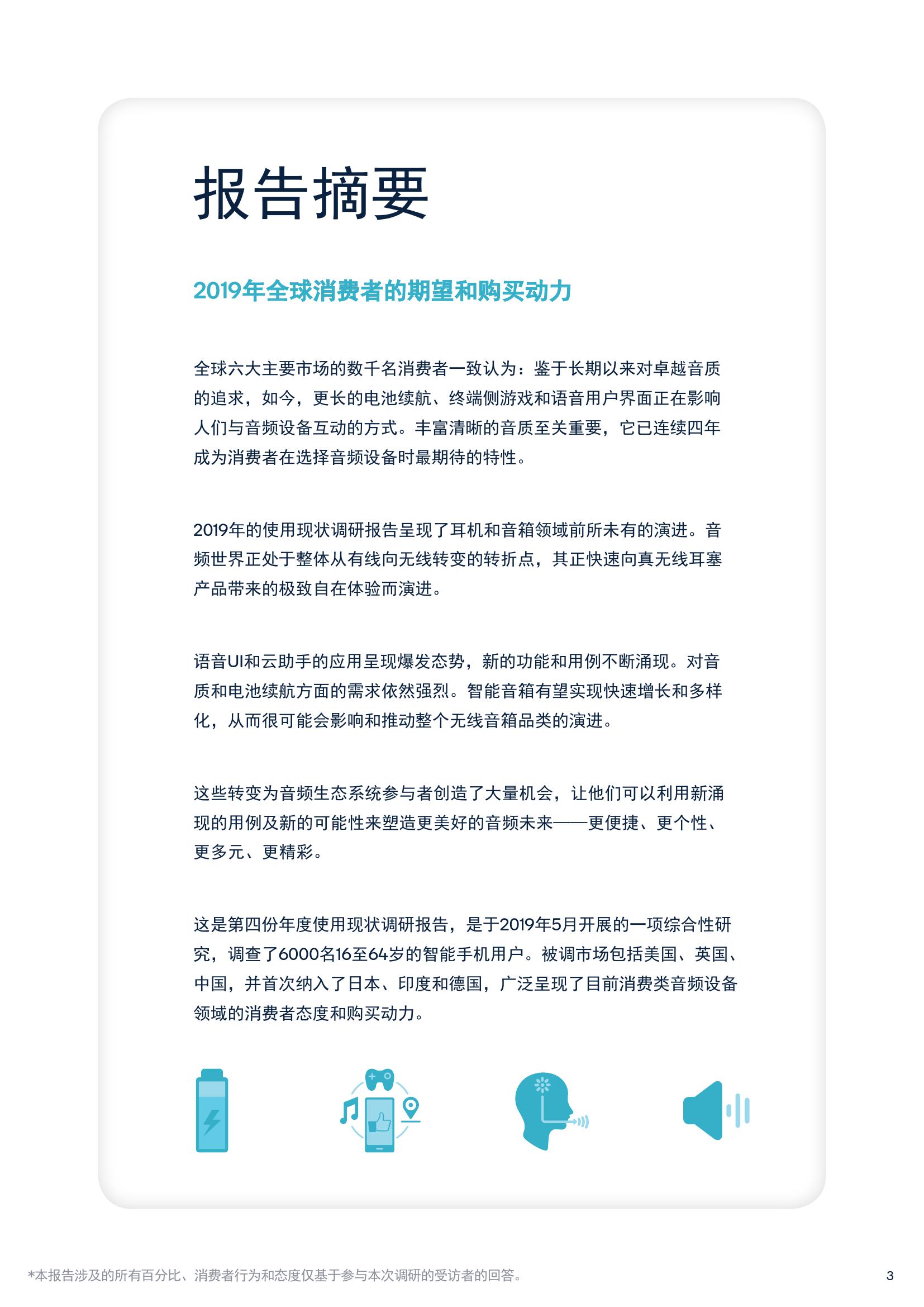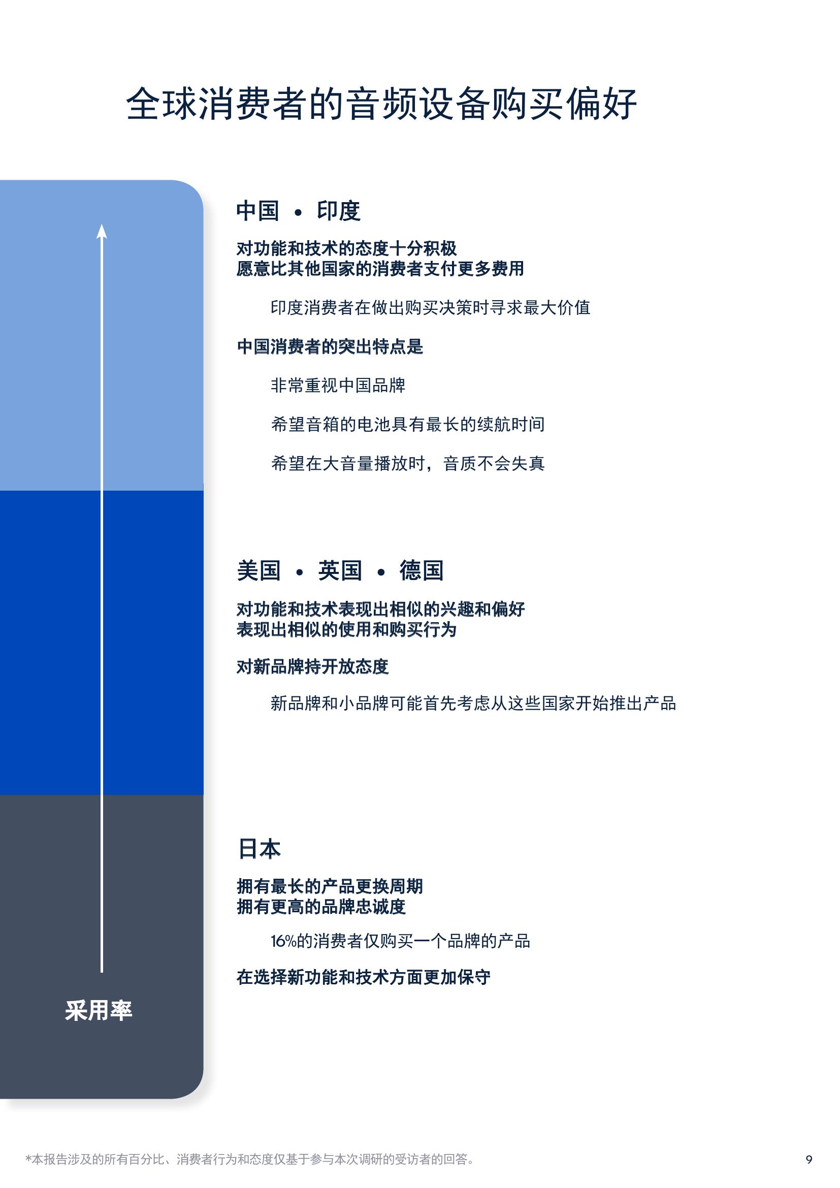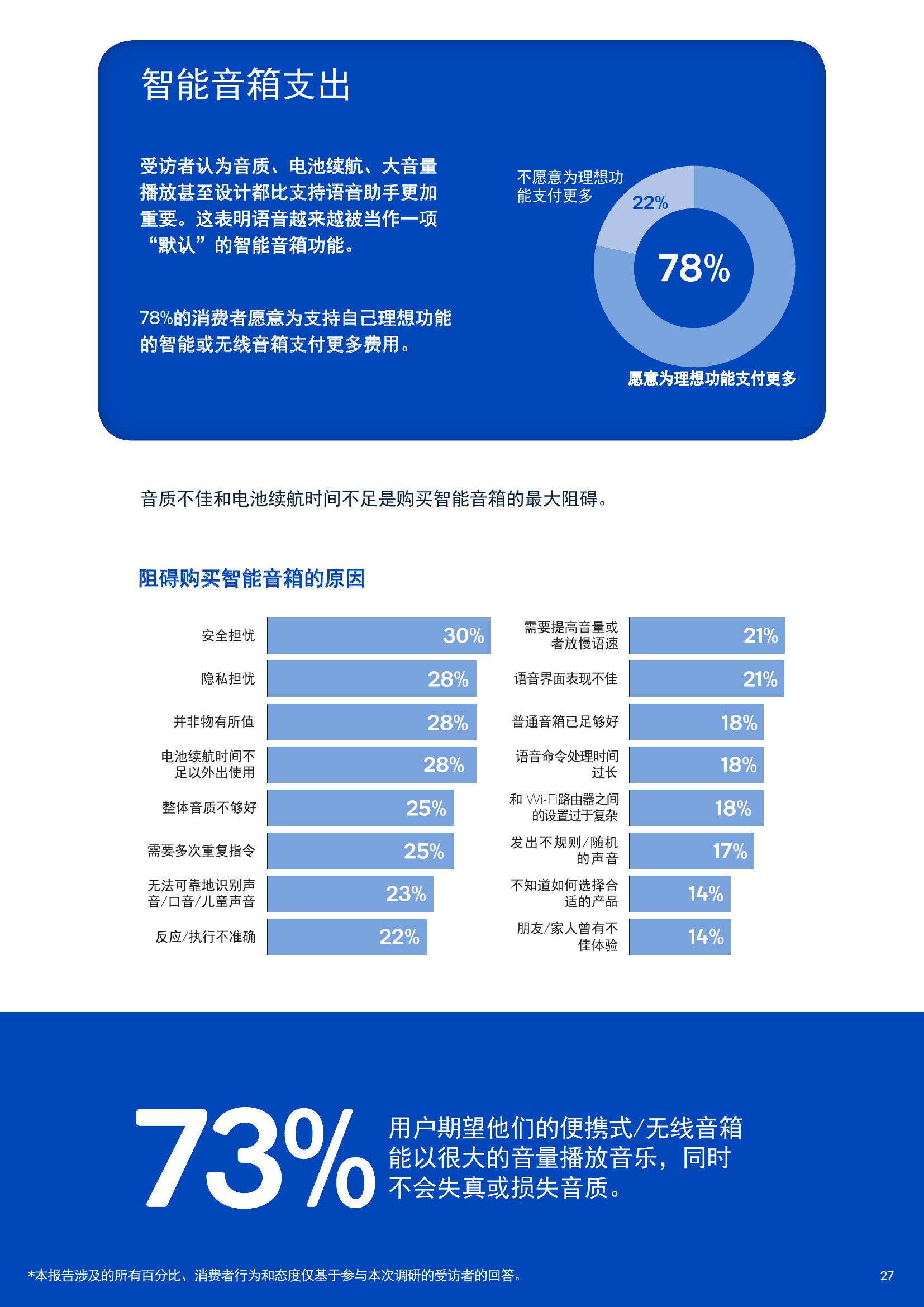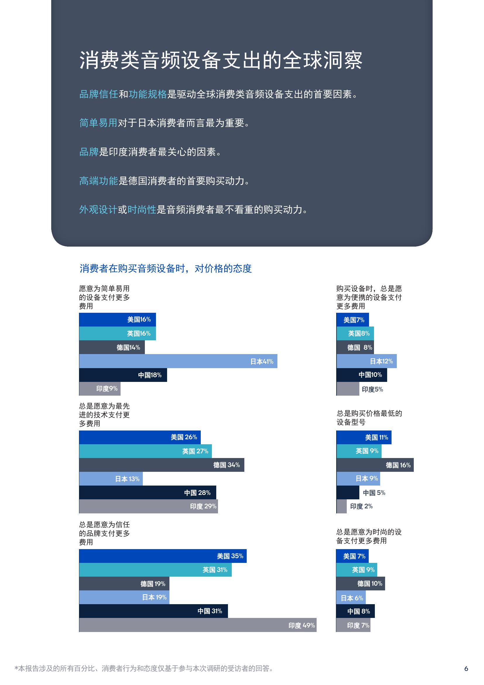 报告中有63%的耳机购买者表示高分辨率音质十分重要,还有64%的智能音箱消费者表示音质是做出购买决策时最看重的因素,78%的条形音箱和家庭影院购买者也表示卓越的音质非常重要。