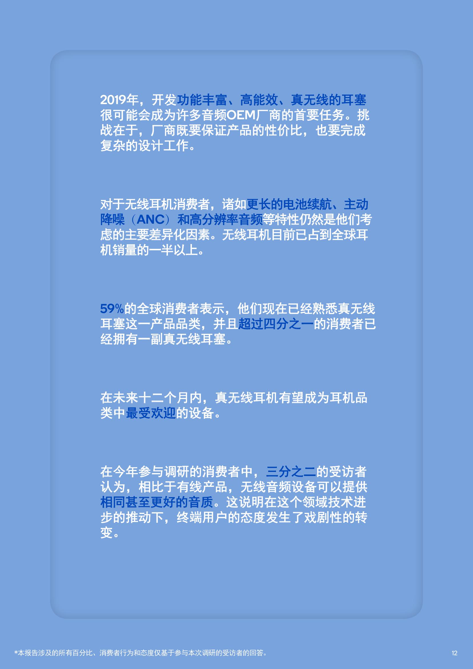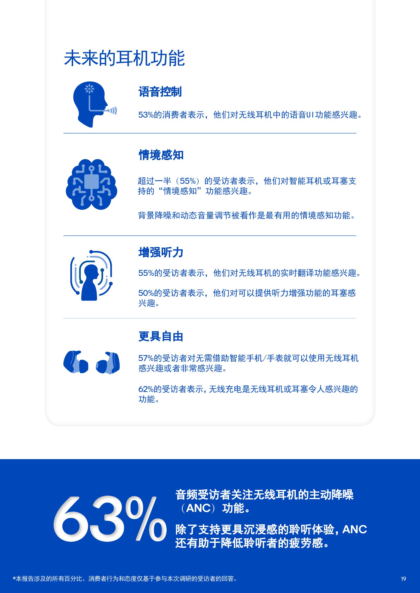 关于无线蓝牙产品,63%的用户关注主动降噪功能;据调查显示60%的无线耳机使用场合为较嘈杂环境。此外,还有53%的消费者对无线耳机中的语音交互功能感兴趣;73%的用户希望无线音箱能以极大的音量播放音乐,同时还能保证音质的质量。