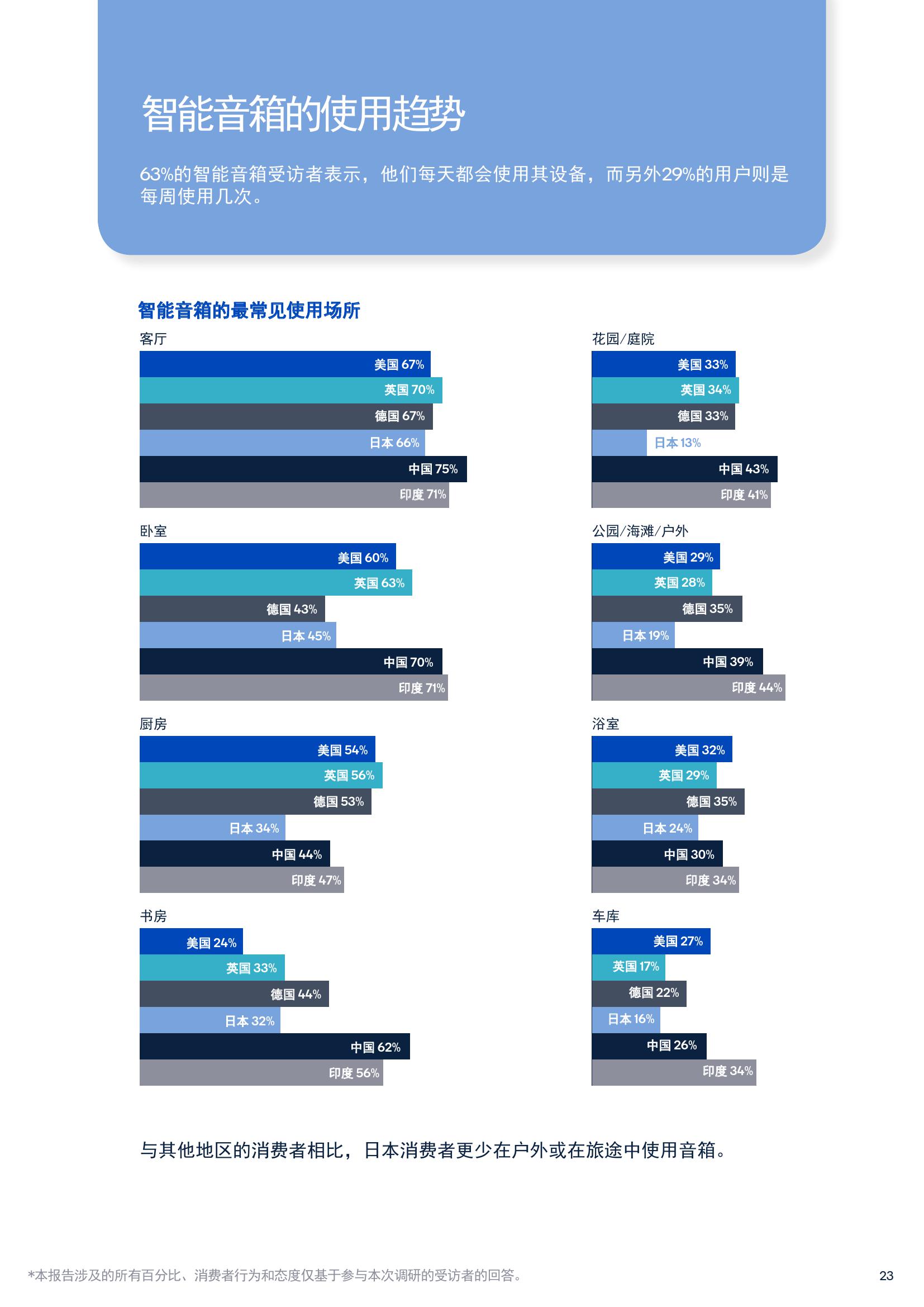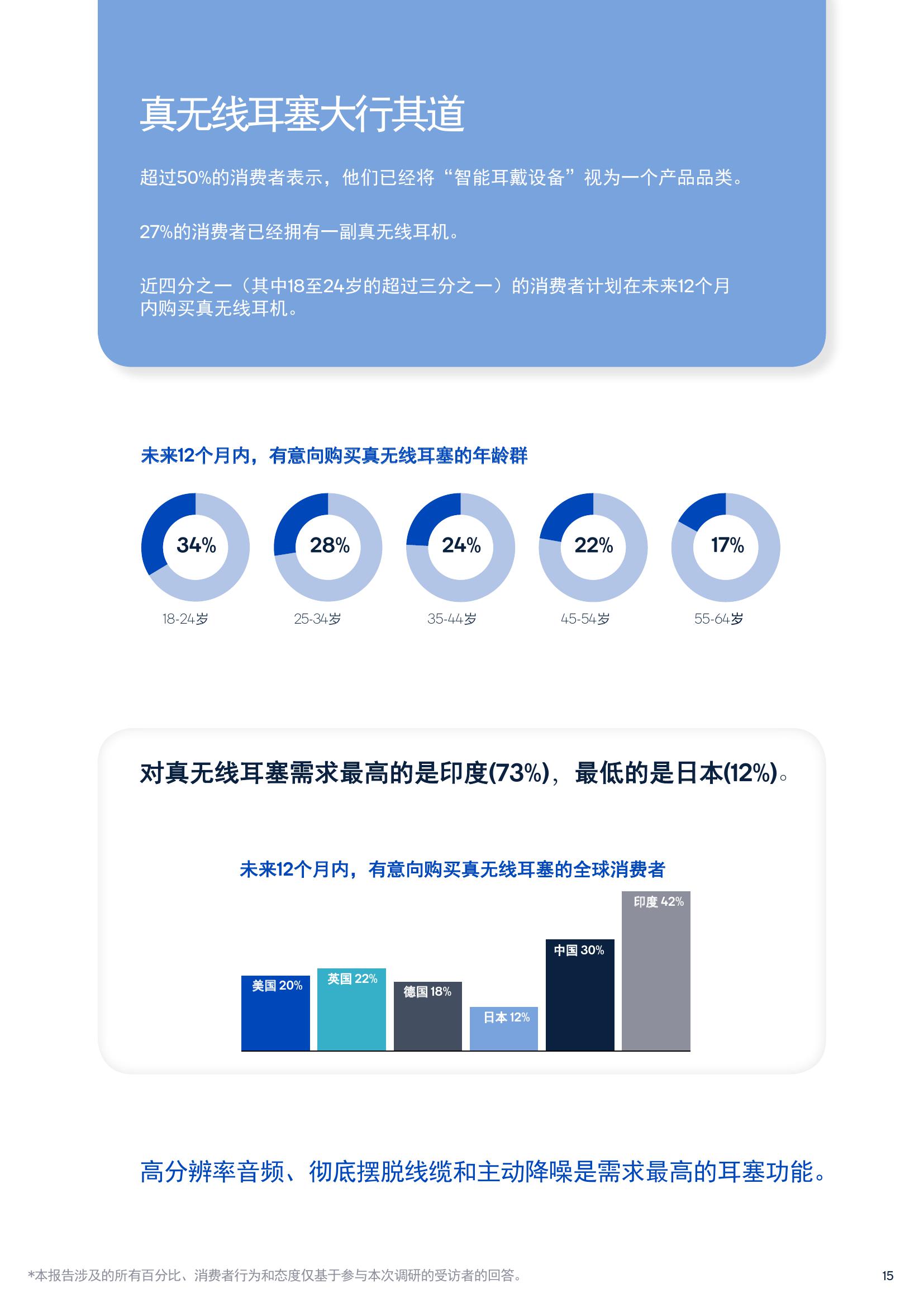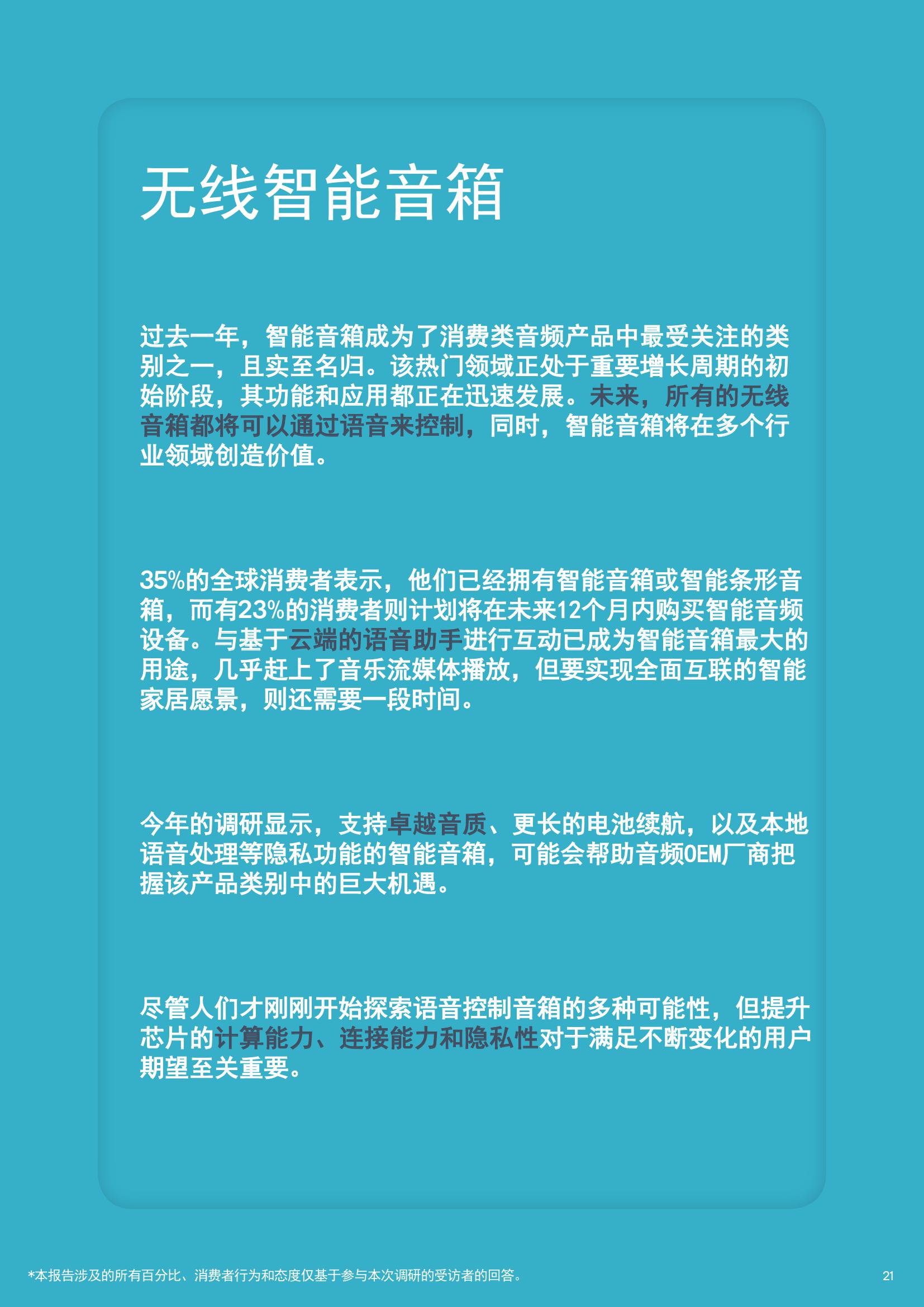 关于智能化产品,35%的受访者表示已经拥有智能音箱或智能条形音箱,而23%的受访者计划在未来12个月内购买智能音频设备。