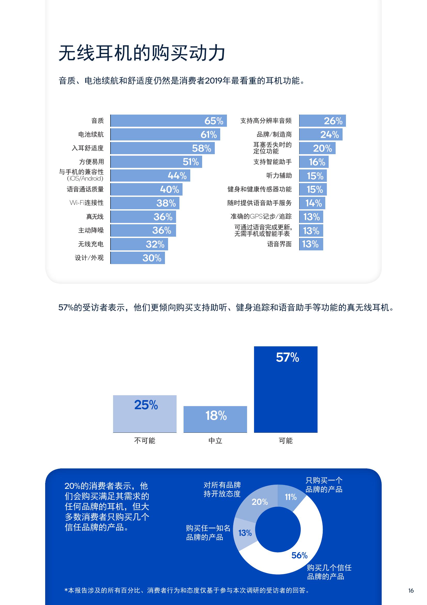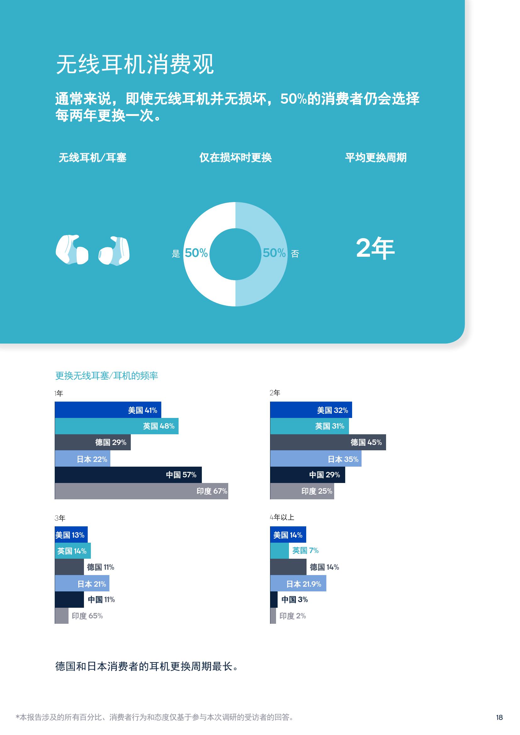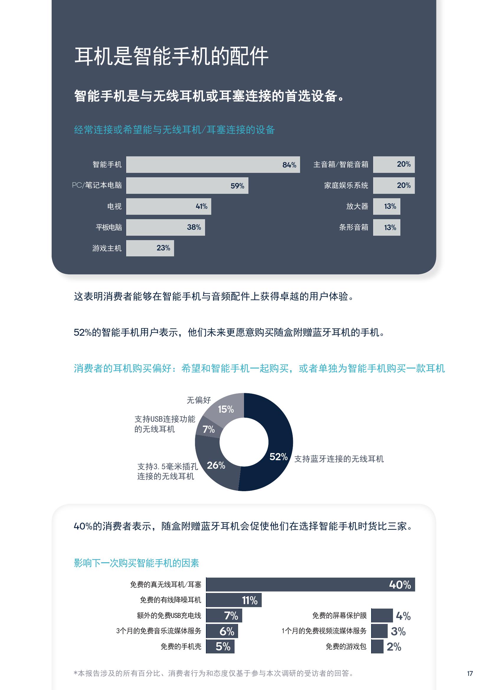 续航方面,61%的消费者认为更长的电池续航是主要购买动力,2018年的调查结果为47%。这一比例的增长也反映了消费者倾向购买无线产品。此外,52%的受访者表示以后更愿意购买随盒附赠蓝牙耳机的手机。