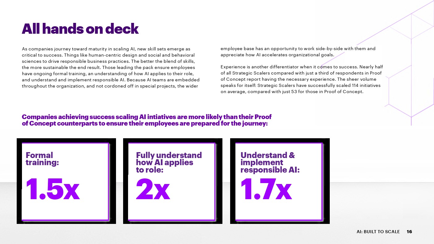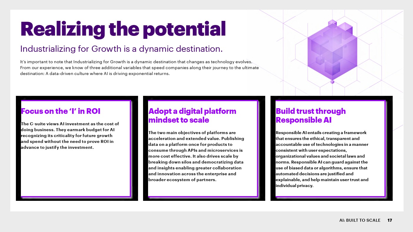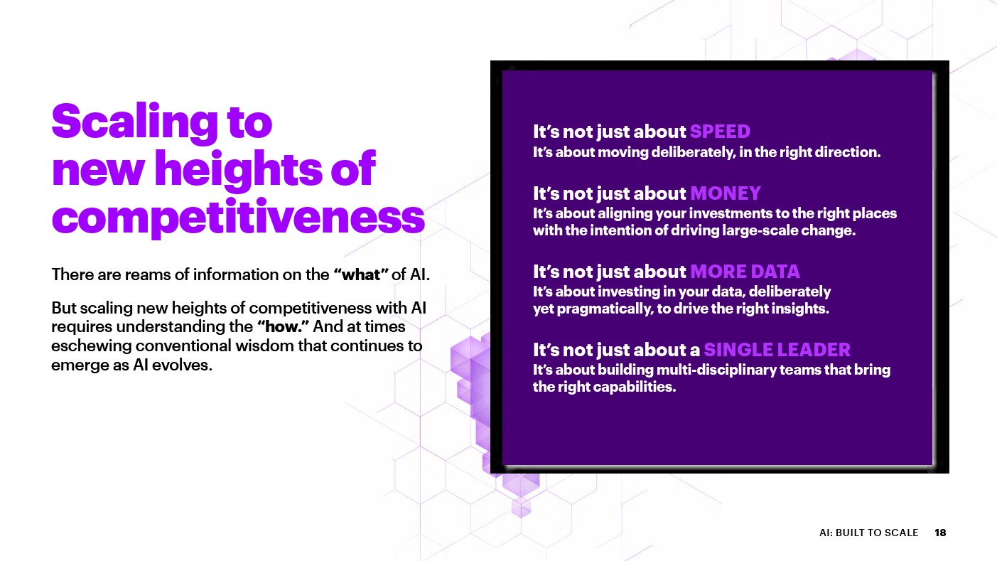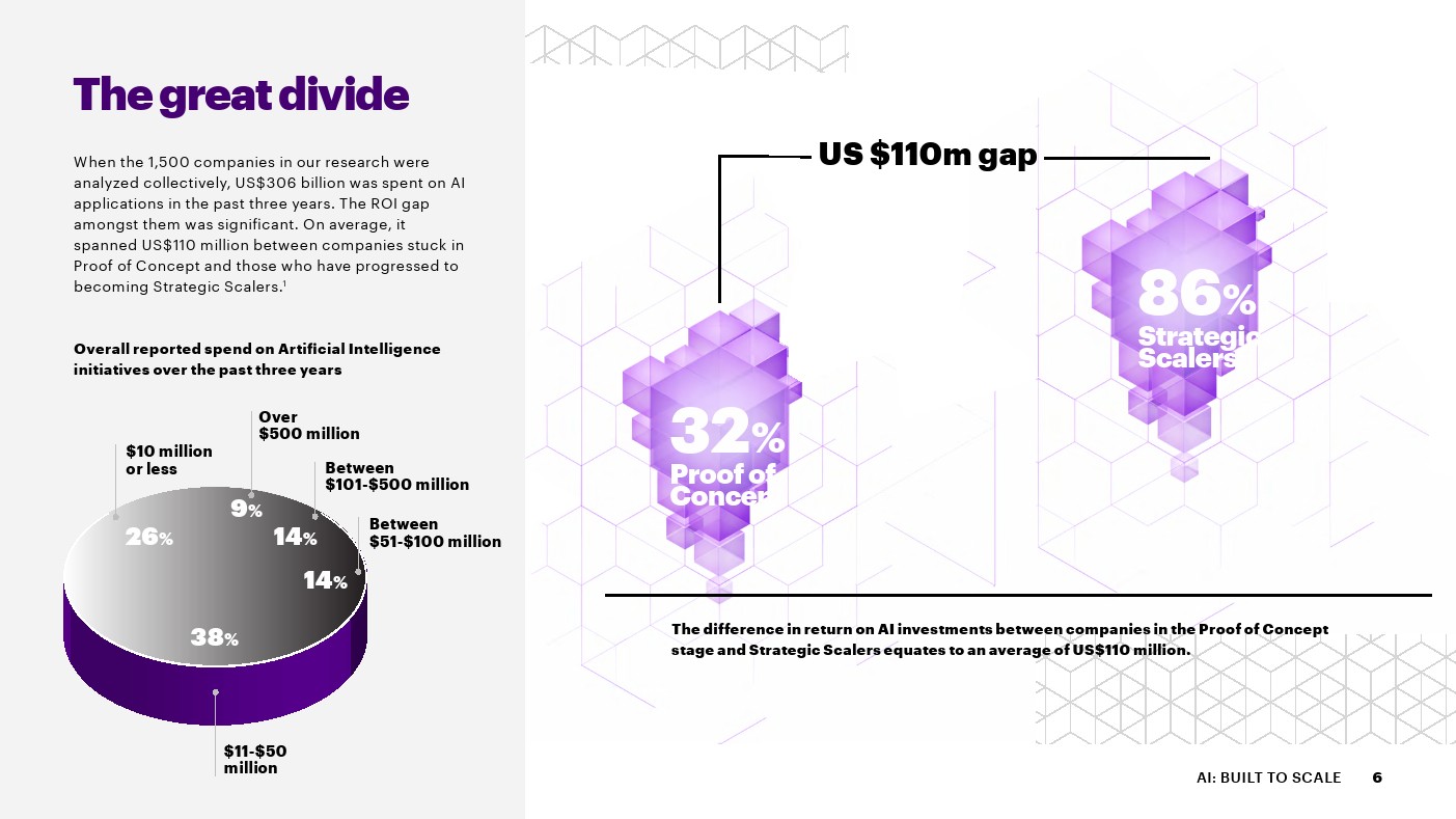 84%的C级高管认为,如果不扩展AI,他们将无法实现其业务战略,但只有16%的高管已经从单纯的试验转变为创建具有强大AI功能的组织。结果,这群表现最好的企业从人工智能投资中获得的回报是绩效较低的企业的近3倍。