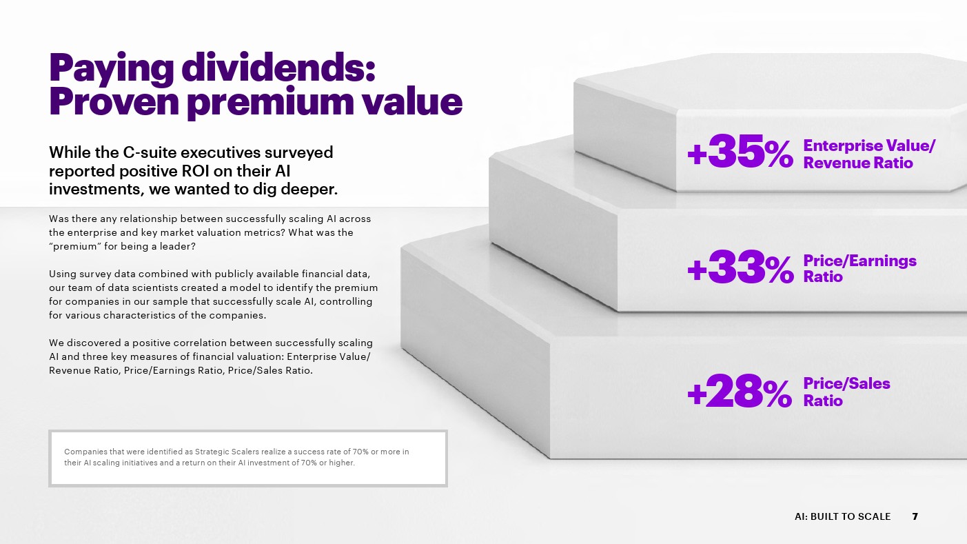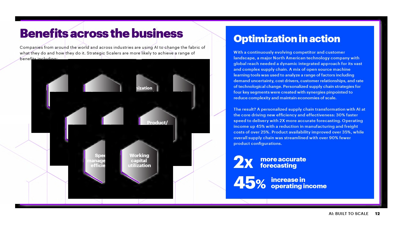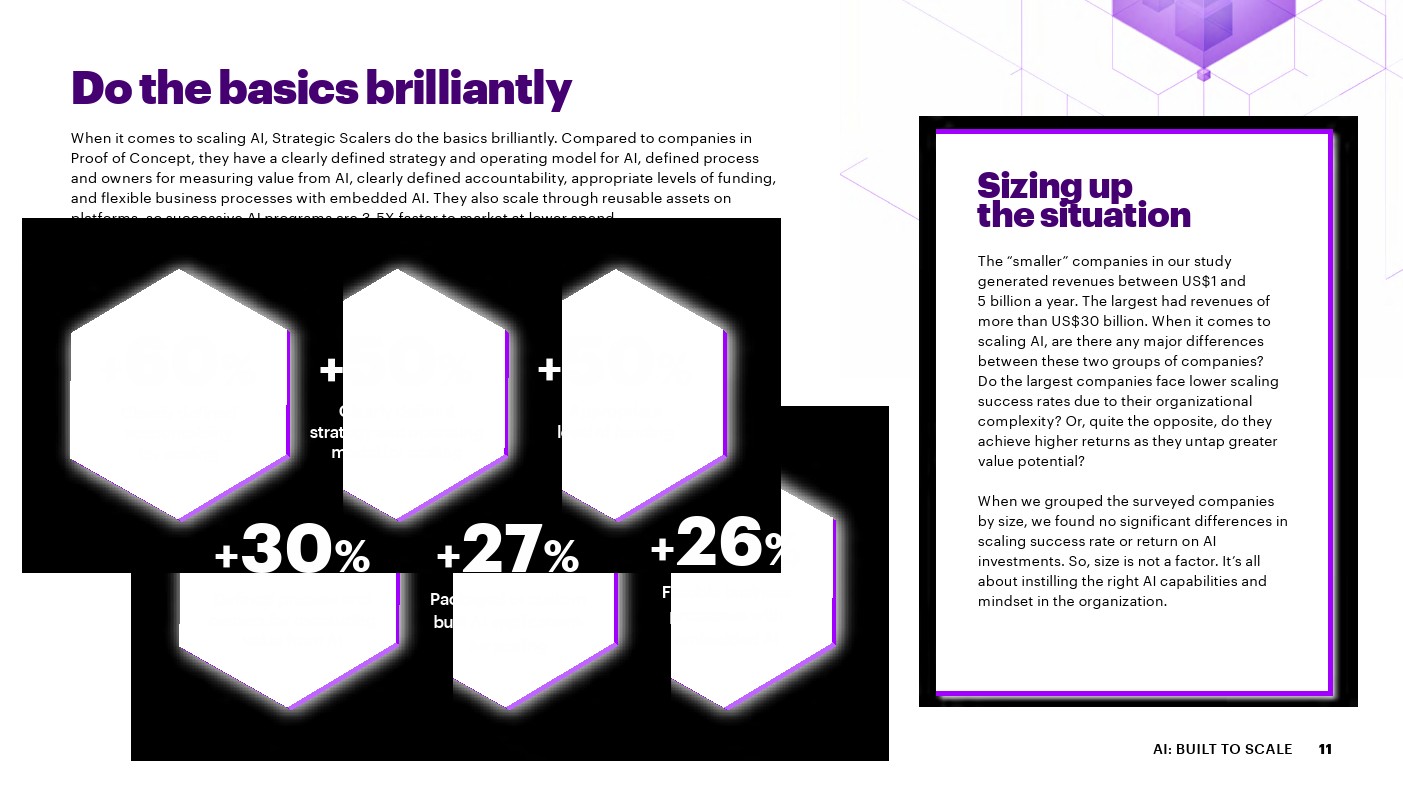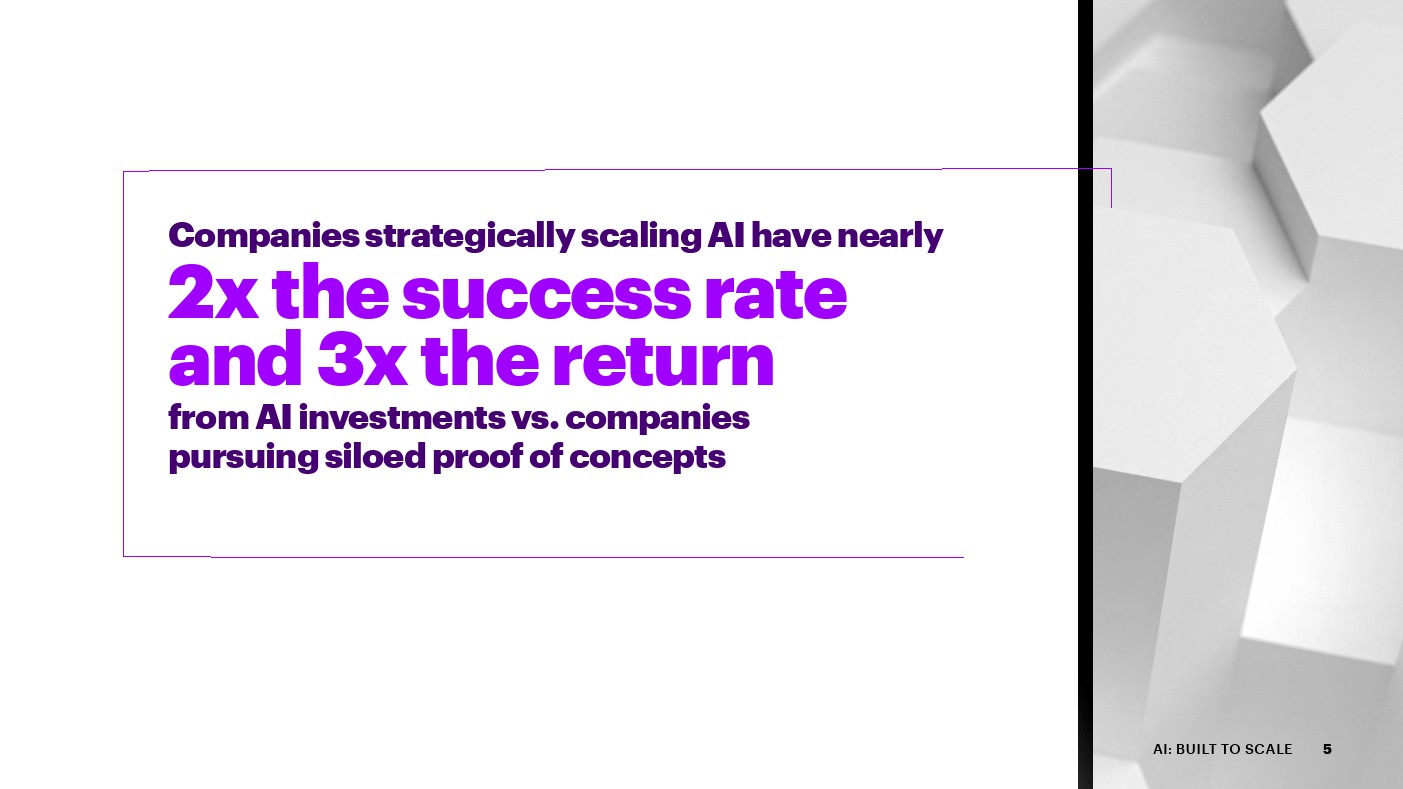 84%的C级高管认为,如果不扩展AI,他们将无法实现其业务战略,但只有16%的高管已经从单纯的试验转变为创建具有强大AI功能的组织。结果,这群表现最好的企业从人工智能投资中获得的回报是绩效较低的企业的近3倍。