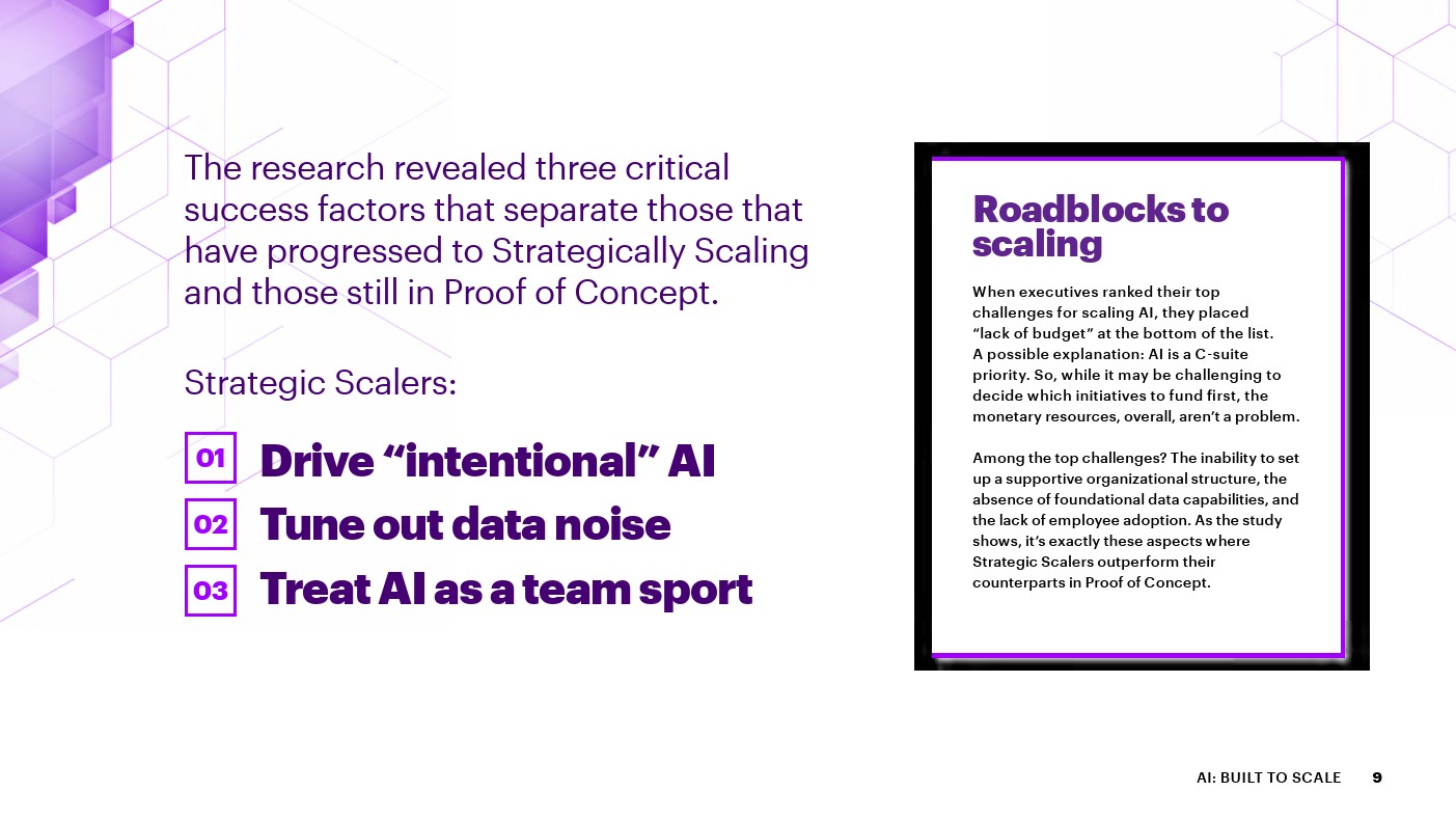 这些顶级绩效企业成功的秘诀在于三个关键要素:强大的数据基础;多个敬业的AI团队;以及由高级管理人员领导的对组织范围内的战略性AI部署的承诺。