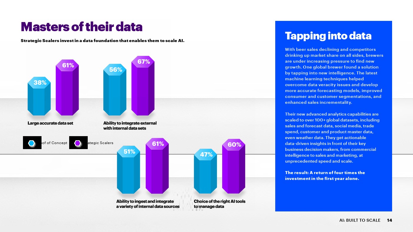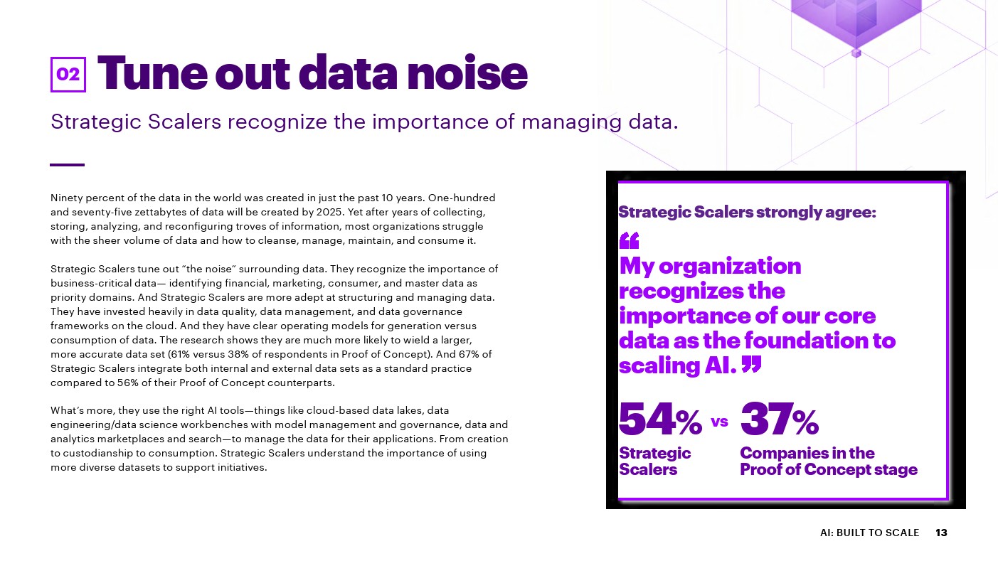 几乎所有的公司(95%)都将数据作为扩展AI基础的重要性,但是表现最好的公司更加专注于确保拥有正确、相关的数据资产来支撑其AI工作。他们更擅长结构化和管理数据,其中61%的企业使用大型、准确的数据集,而2/3的企业(67%)有效地集成了内部和外部数据集。