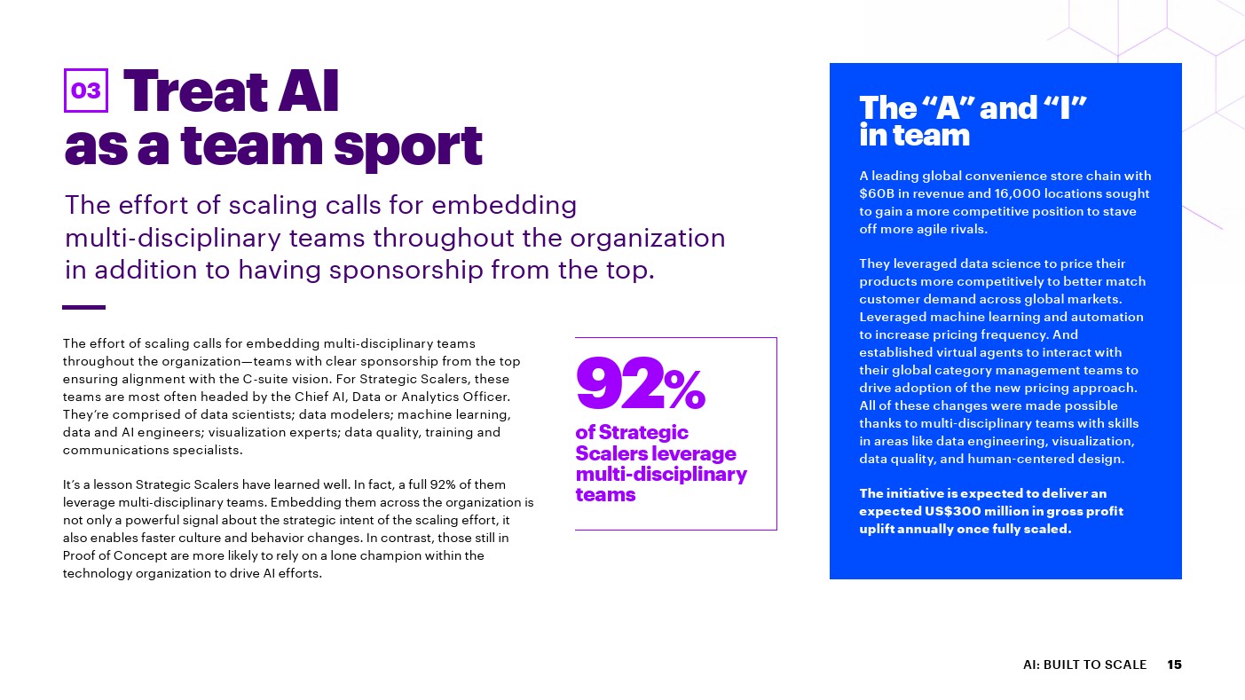 高绩效人才的另一个关键特征进一步巩固了这种战略方法,即召集合适的人才来推动业绩。92%的企业没有依靠一个AI人才,而是在整个组织中战略性地嵌入了多学科团队。这种跨职能的方法还有助于确保思维的多样性,这不仅可以为负责任的AI之类的考虑带来切实的好处,而且还可以最大程度地提高组织从其AI部署中看到的价值。