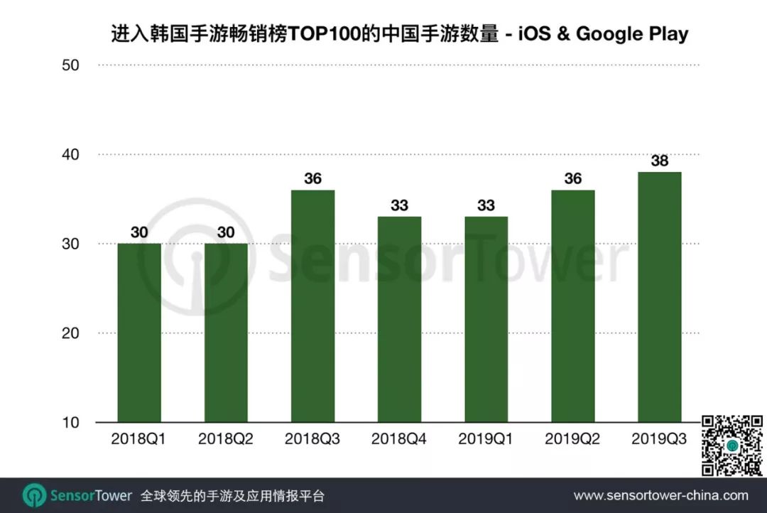进入韩国市场收入TOP100的中国手游合计贡献2亿美元,同比和环比均增长25%;数量进一步增长至38款,收入占比达到24.8%,为有史以来最好的成绩。