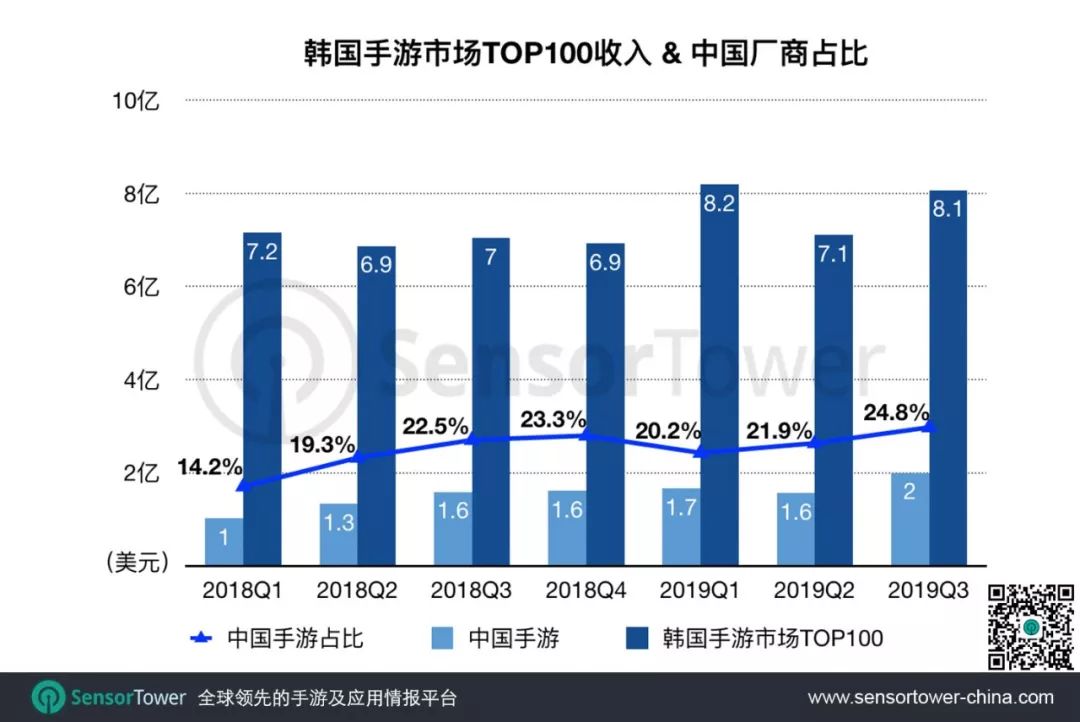 Sensor Tower 商店情报最新数据显示,韩国手游市场在今年Q3虽然下载量趋于平缓,但收入再创历史最高。同时,在韩国市场收入Top100手游中,中国厂商的产品达到38款,收入占比高达24.8%,是迄今为止最好的成绩。详细数据如下。