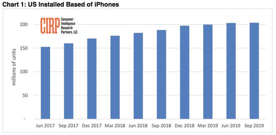 在CIRP的报告中,苹果在美国的iPhone销量持续增长正慢慢陷入停滞,跟去年相比,其连续季度的销量增长可以说是微乎其微。据估计,苹果在美国的iPhone安装基数在9月季度达到了2.04亿台。