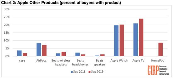 在这份报告中可以看到,Apple TV以接近25%的用户拥有率继续保持着该公司拥有最多产品的领先地位,紧随其后的则是Apple Watch–拥有率约为20%、HomePod和AirPods–拥有率在5%至10%之间。尽管榜单上的大多数产品的拥有率跟2018年9月的水平相当,但Apple TV的拥有率有所增长、HomePod的拥有率似乎超过了保护套和Beats设备。