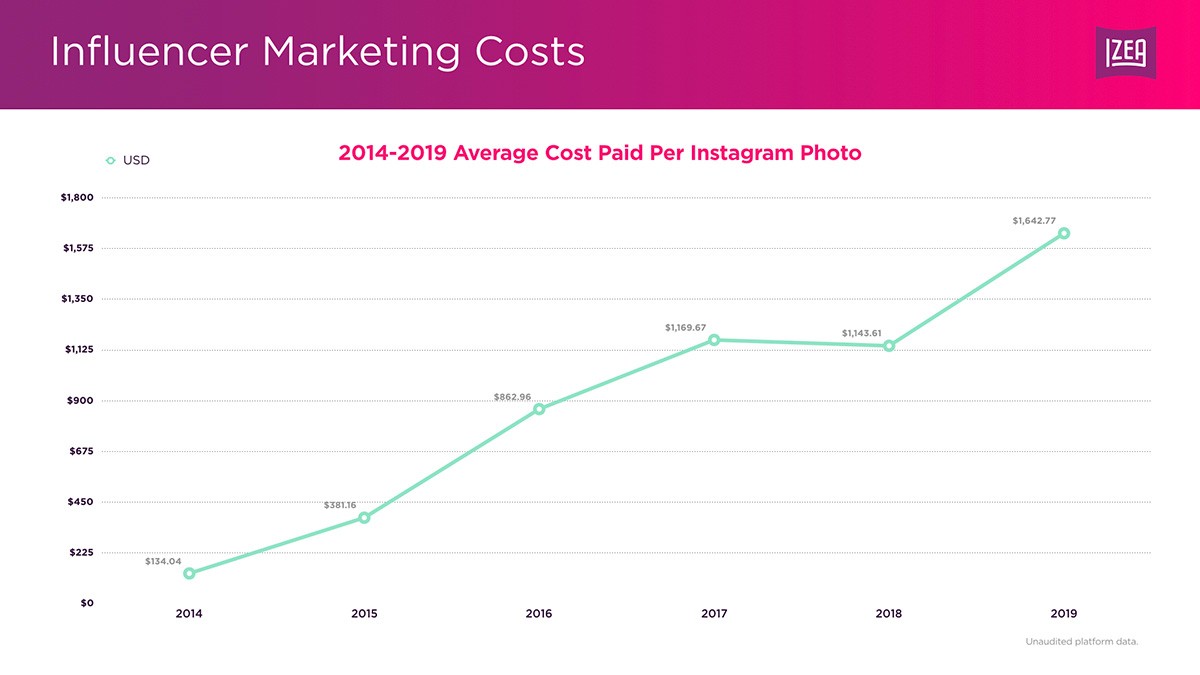 2018-2019年,Instagram上一张赞助照片的平均成本上涨了44%。IZEA是将品牌和发行商与意见领袖联系在一起的在线市场.该公司发布了对其在线市场中观察到的意见领袖价格点的分析,这些价格点跨越了意见领袖营销的整个生命周期。