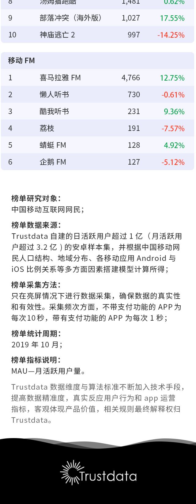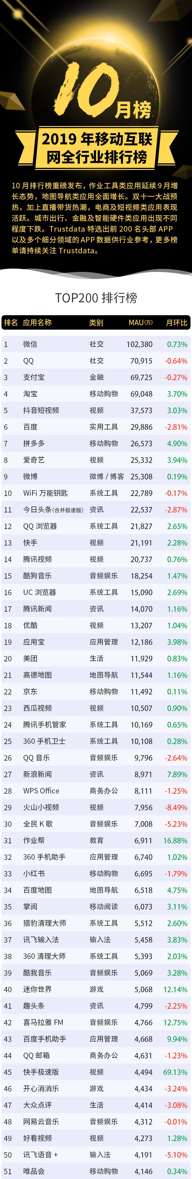 Trustdata:2019年10月移动互联网全行业排行榜 更多阅读:Trustdata:2020年8月移动互联网全行业排行榜Trustdata:2022年10月移动互联网全行业排行榜Trustdata:2019年7月移动互联网全行业排行榜Trustdata:2020年10月移动互联网全行业排行榜Trustdata:2020年7月移动互联网全行业排行榜Trustdata:2020年12月移动互联网全行业排行榜Trustdata:2020年3月移动互联网全行业排行榜Trustdata:2020年6月移动互联网全行业排行榜Trustdata:2020年2月移动互联网全行业排行榜Trustdata:2021年4月移动互联网全行业排行榜Trustdata:2020年1月移动互联网全行业排行榜Trustdata:2021年5月移动互联网全行业排行榜Trustdata:2021年6月移动互联网全行业排行榜Trustdata:2019年12月移动互联网全行业排行榜Trustdata:2019年11月移动互联网全行业排行榜