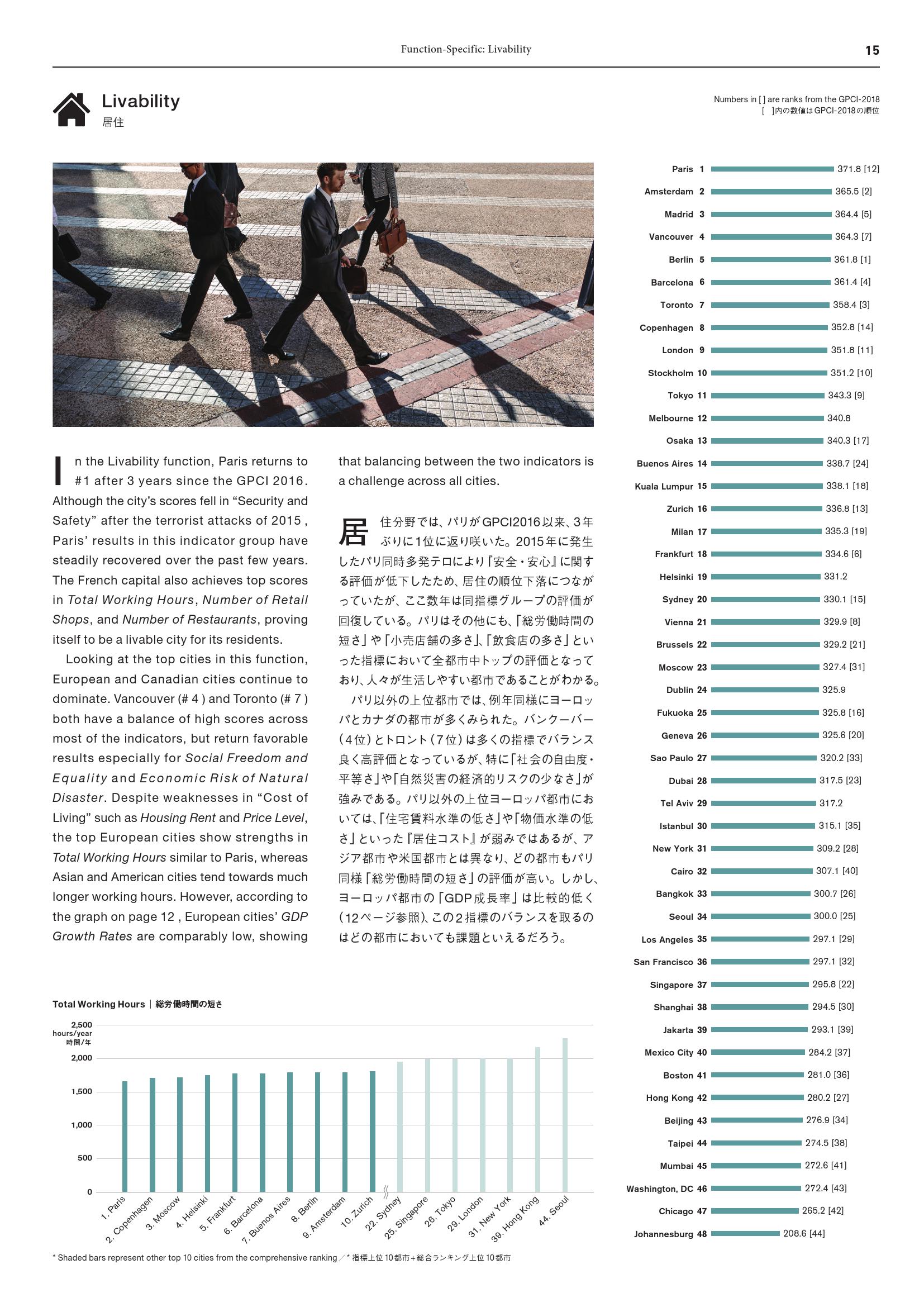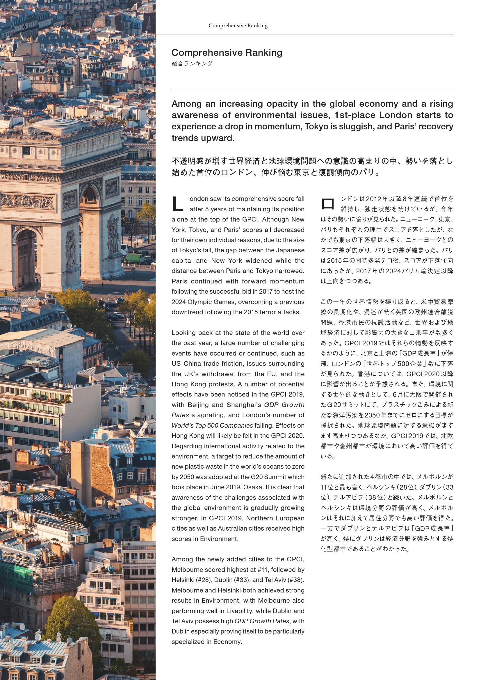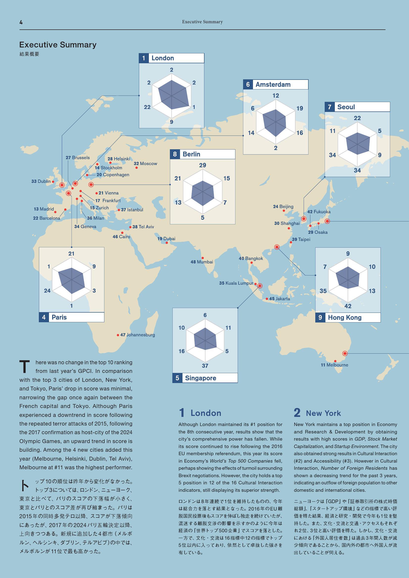 - 巴黎(第4名):在因2015年恐怖袭击导致得分下降之后,巴黎在“外国游客数量”和“谋杀案数量”两项的得分均有所改善。由于巴黎和东京将分别主办2024年和2020年奥运会,预计二者的城市实力之争将日益激烈。