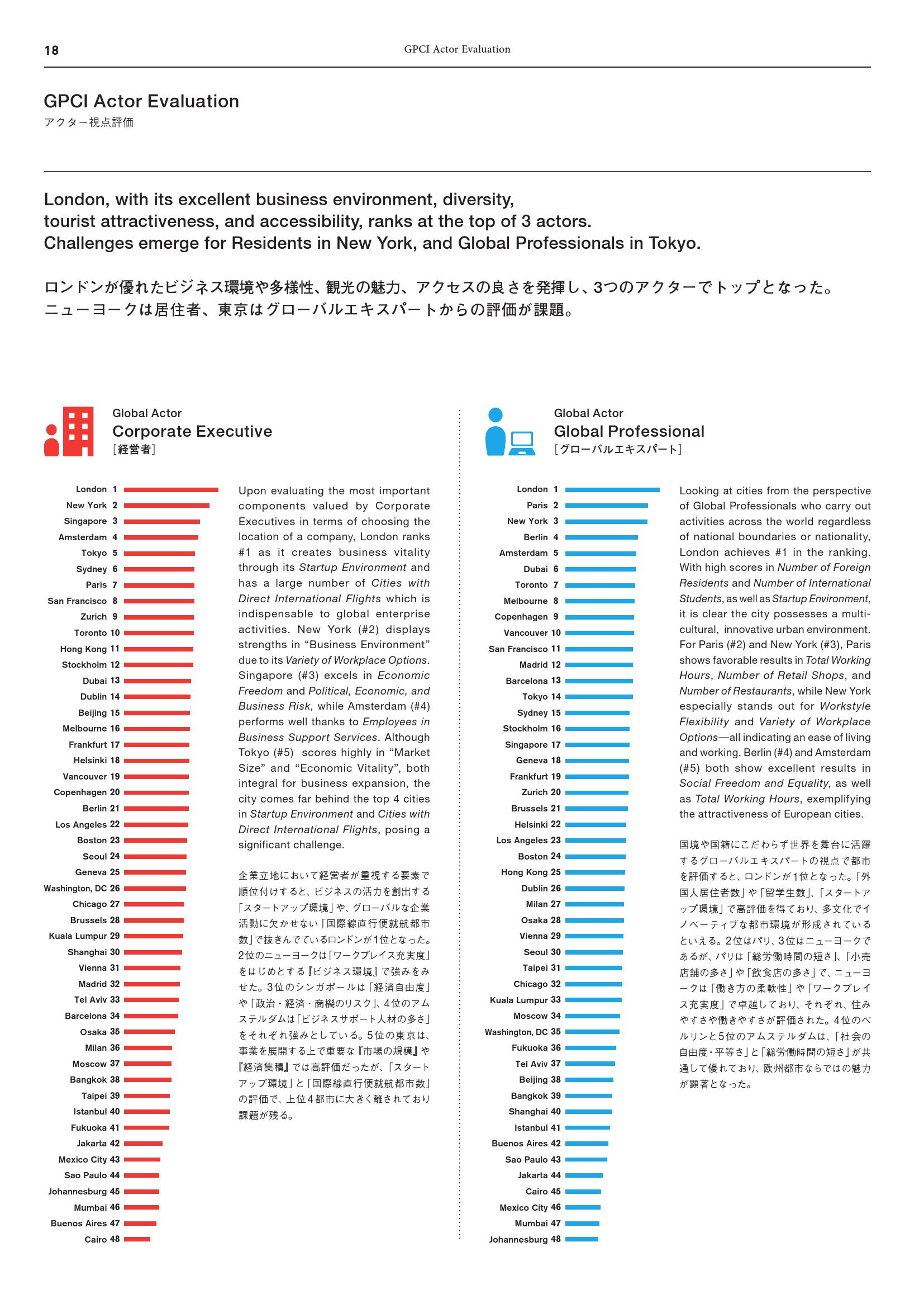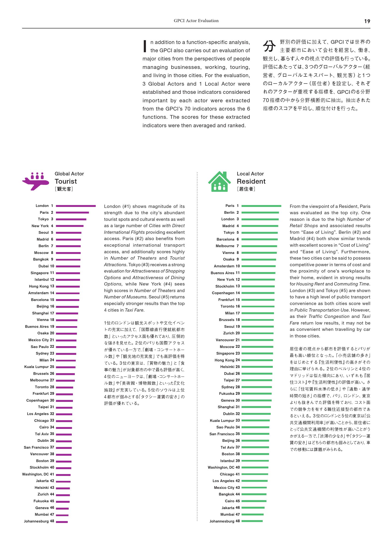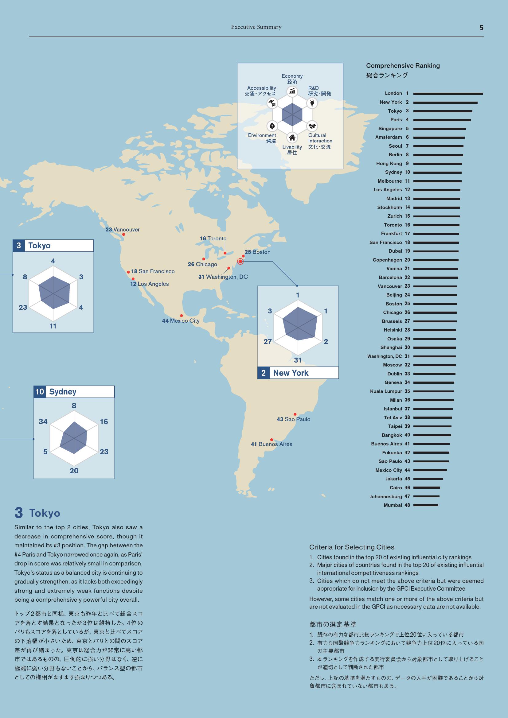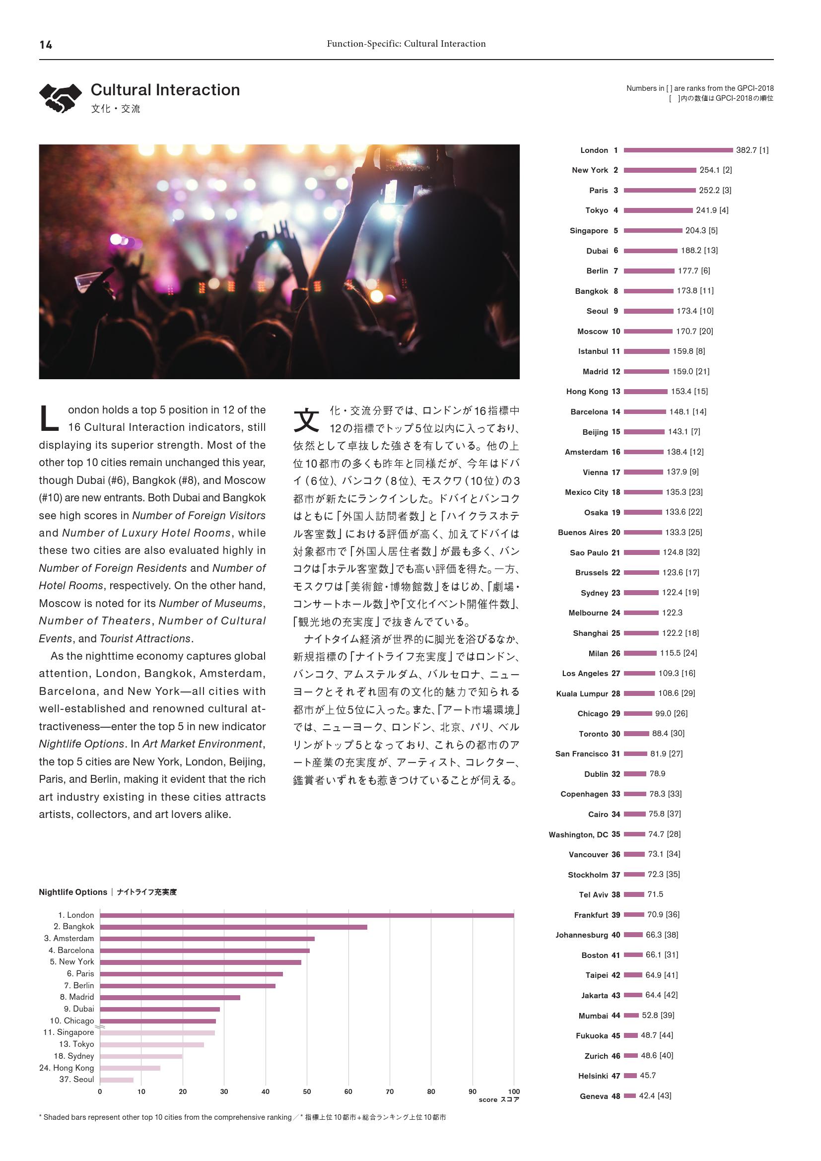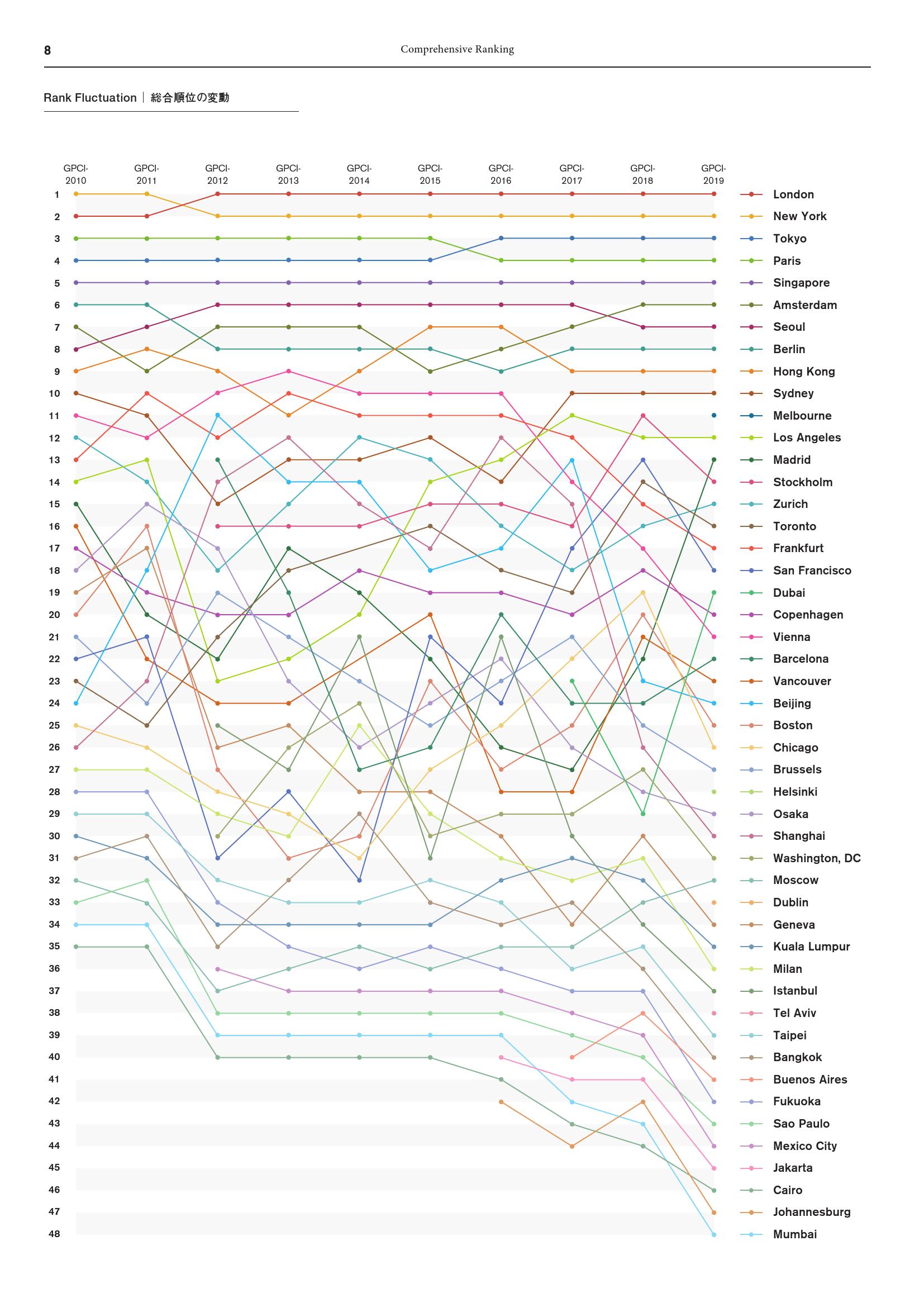 - 东京(第3名):尽管得分下滑,但仍然保持第三名。虽然北京(第24名)由于“政治、经济和商业风险”得分改善赶超东京,但随着奥运会的临近,东京的文化互动得分提高。东京在“饮食选择吸引力”指标获得高分,而“博物馆数量”和“夜生活选择”得分欠佳,表明东京有必要提升对游客的吸引力。