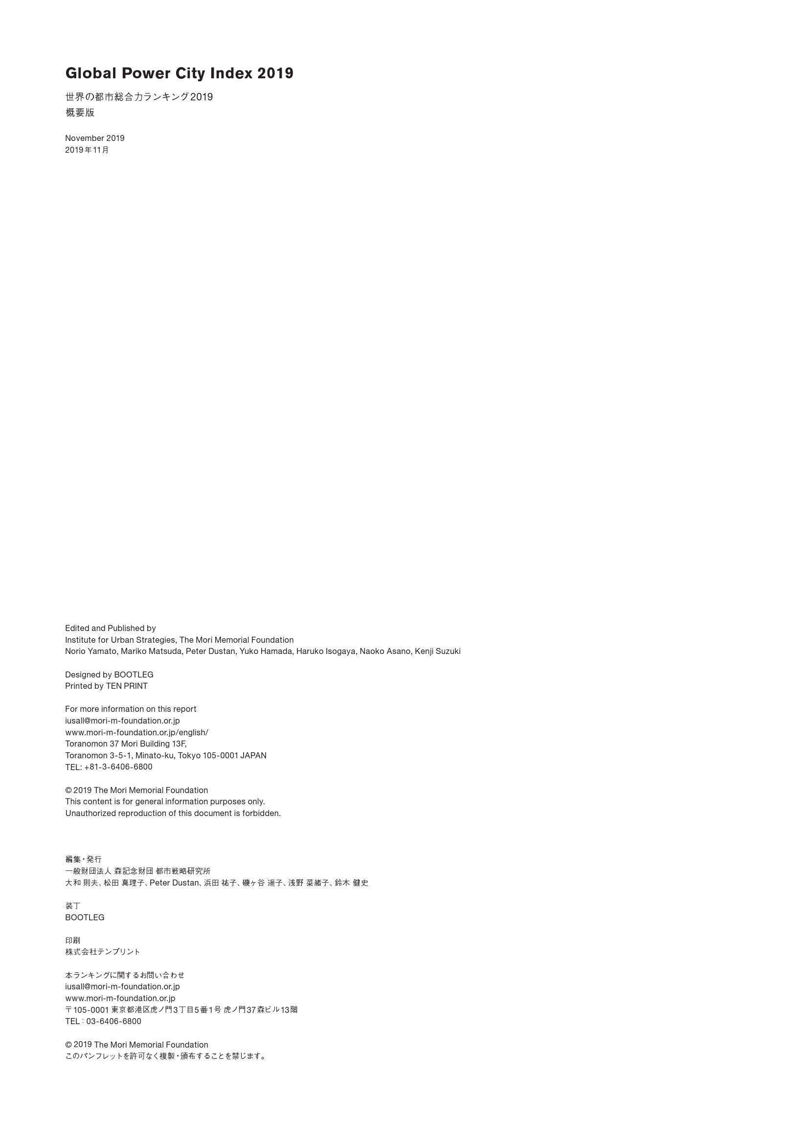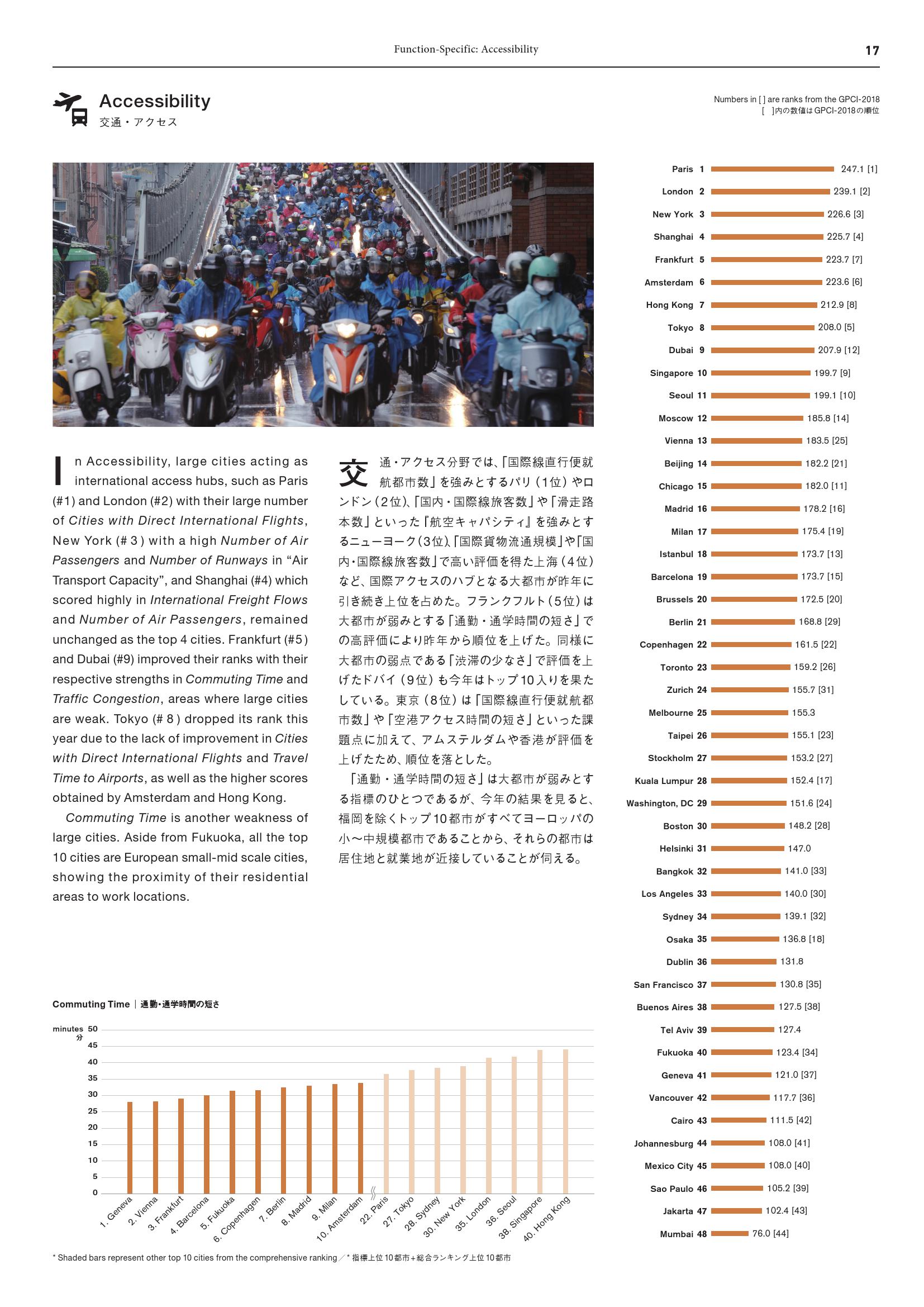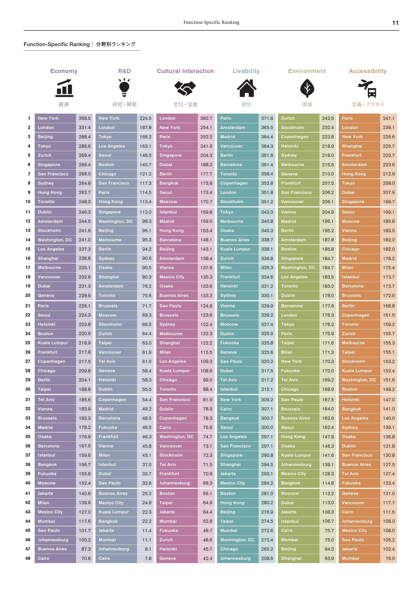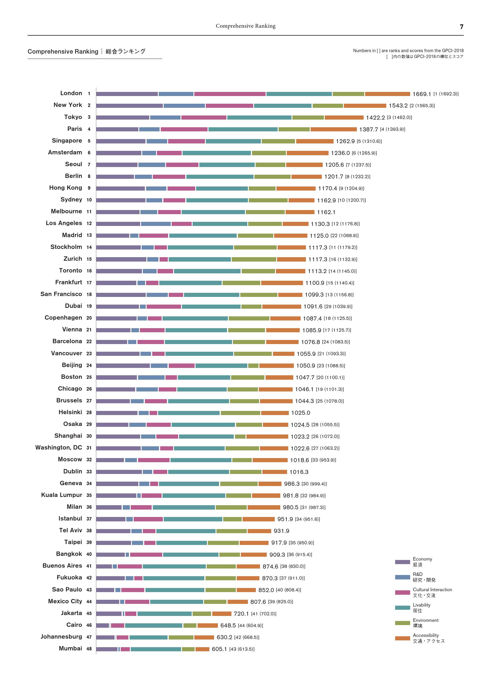 由东京领先的城市开发商森大厦株式会社(Mori Building)创立的研究机构森纪念财团城市战略研究所(The Mori Memorial Foundation’s Institute for Urban Strategies)发布2019年全球城市实力指数(GPCI)报告,伦敦、纽约、东京和巴黎(依排名顺序)再次入选全球最具综合吸引力的城市。自2008年以来,一年一度的GPCI报告根据城市“磁力”(即吸引全球创造性人才和企业的整体实力)对40多个主要城市进行了排名。报告根据六大类(功能)的70项指标对城市进行评分,包括经济、研发、文化互动、宜居、环境和便利度。针对全球城市所处环境的变化,GPCI会不断完善其衡量指标和数据采集方法。
