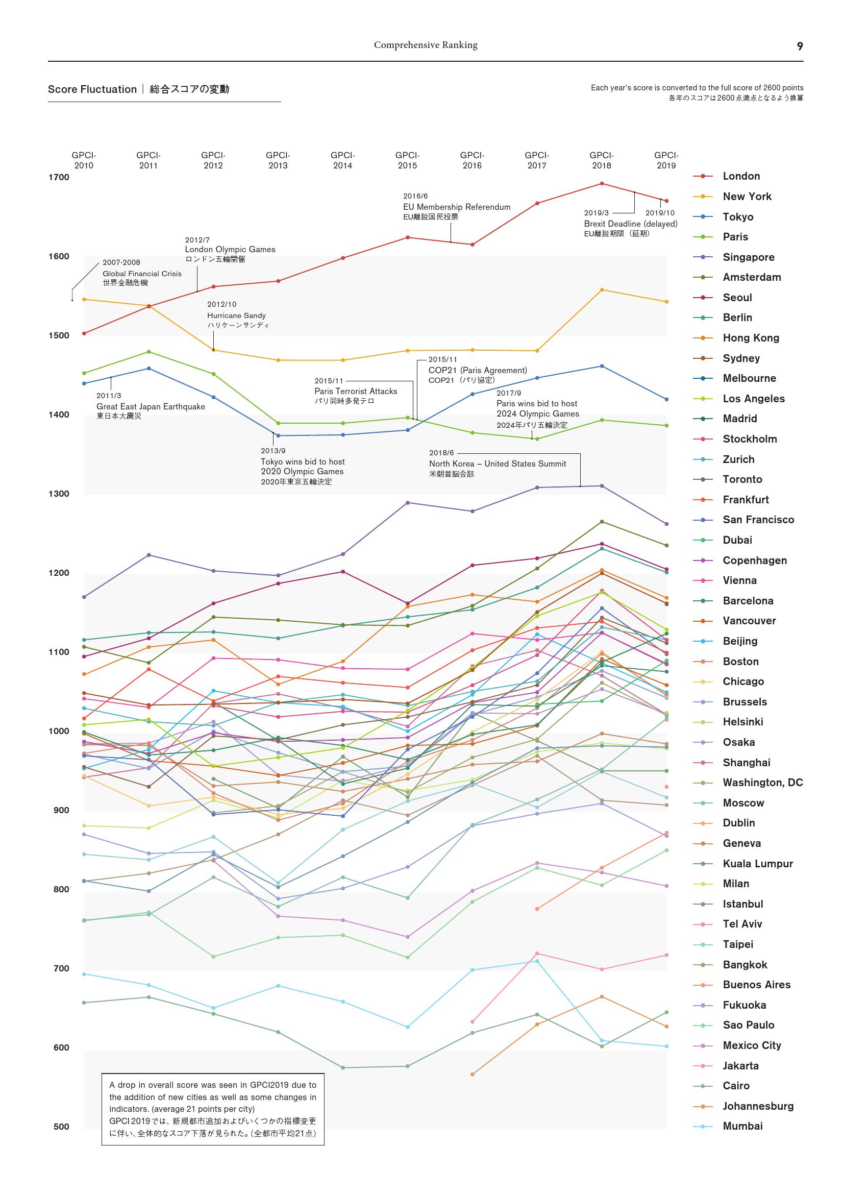 由于全球经济日趋不明朗,人们对环境问题的意识不断提升,在占据GPCI榜首八年之后,伦敦的综合得分出现下滑。虽然纽约、东京和巴黎的得分均由于自身原因有所降低,但东京的下降幅度拉大了其与纽约之间的差距,而东京和巴黎之间的差距则收窄。在2017年赢得2024年奥运会主办权之后,巴黎继续前进,扭转了之前因2015年恐怖袭击造成的下降趋势。