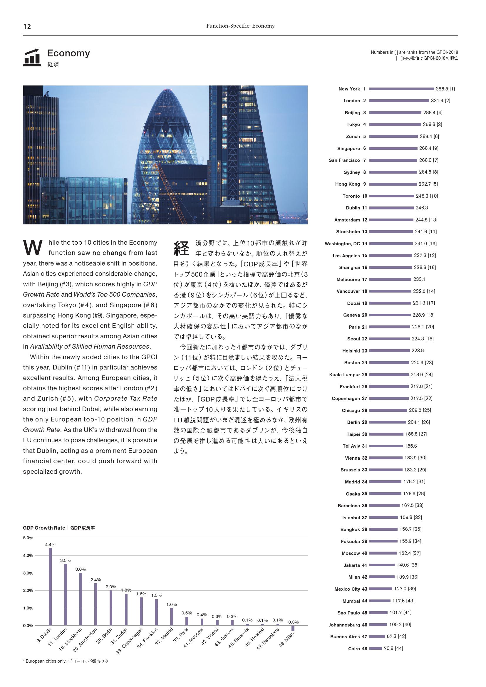 2019年发生或继续出现了大量极具挑战性的事件,例如中美贸易摩擦、英国打算脱欧和香港抗议活动。对GPCI 2019得分产生明显影响的因素包括北京和上海“GDP增长率”放缓,以及伦敦“世界500强公司”数量减少。香港政治动乱的影响可能将在2020年GPCI中反映出来。