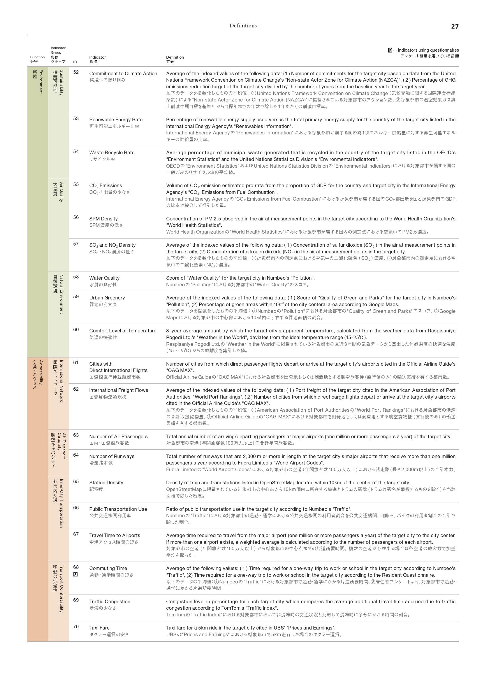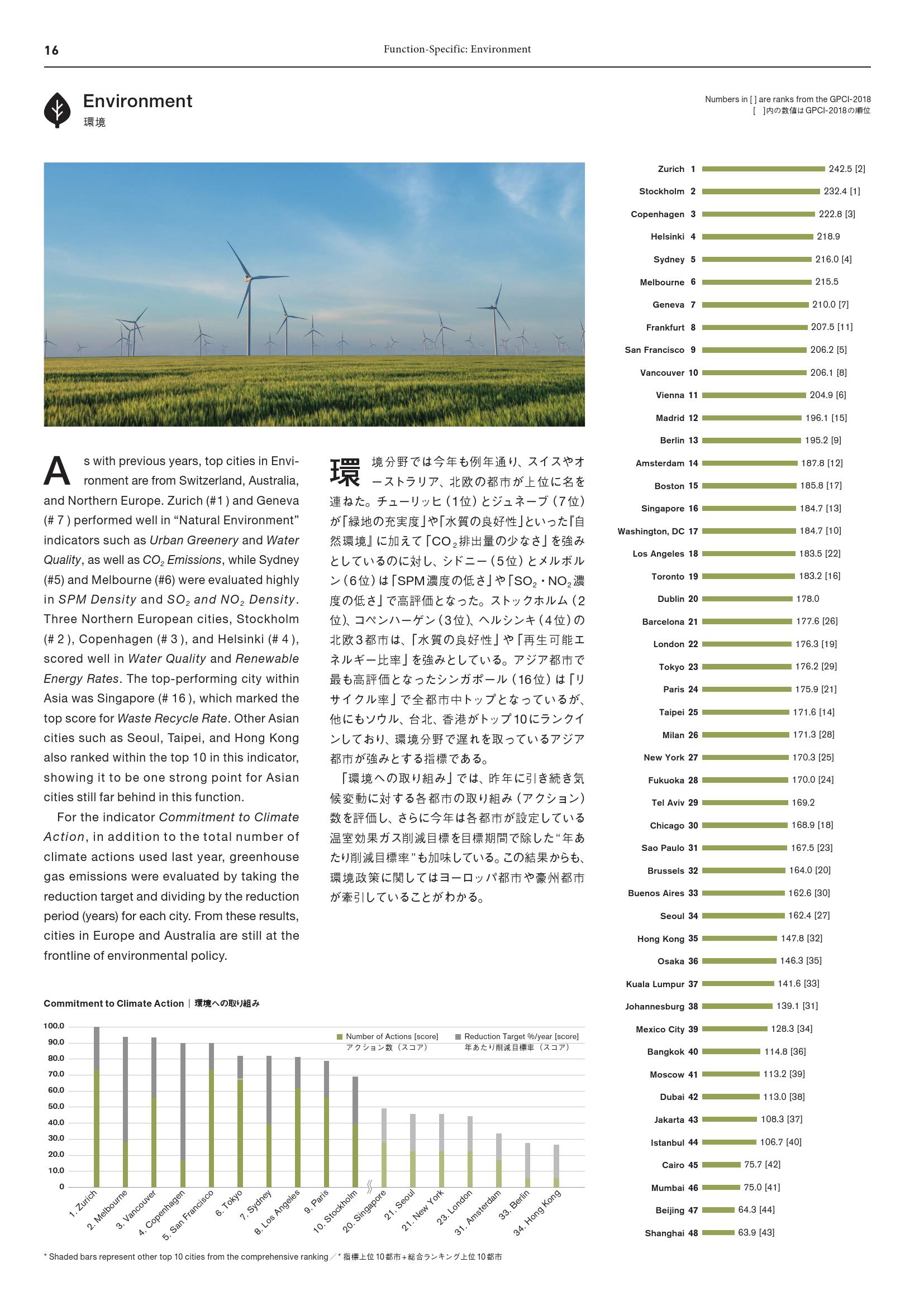 - 苏黎世(第15名)和日内瓦(第34名)在“城市绿化率”和“二氧化碳排放”等环境类别指标获得高分,而斯德哥尔摩(第14名)和哥本哈根(第20名)在“水质”和“可再生能源率”指标表现出色。