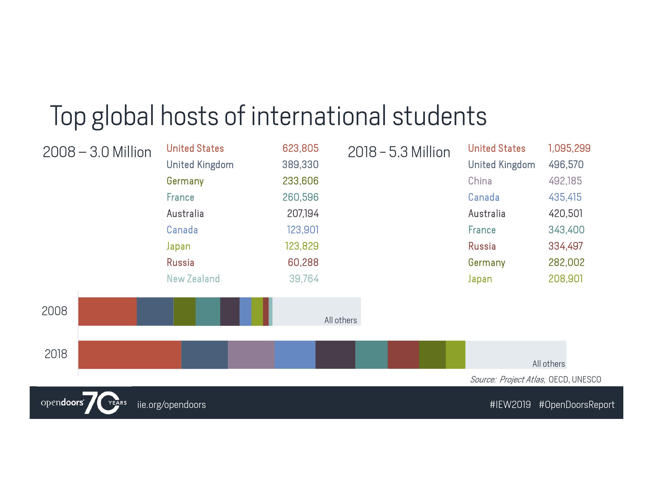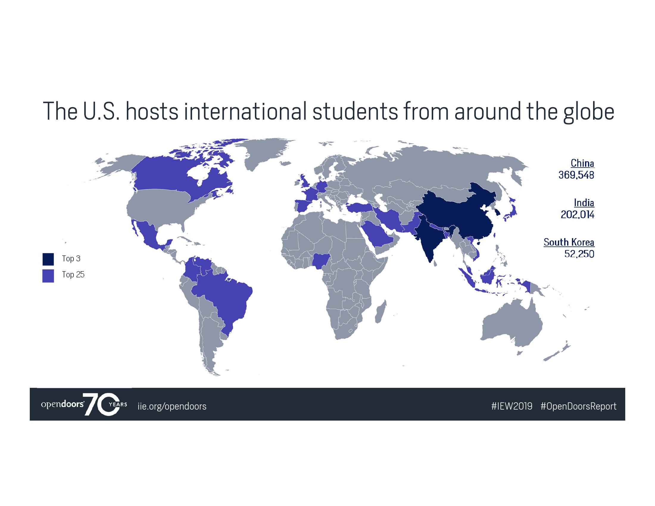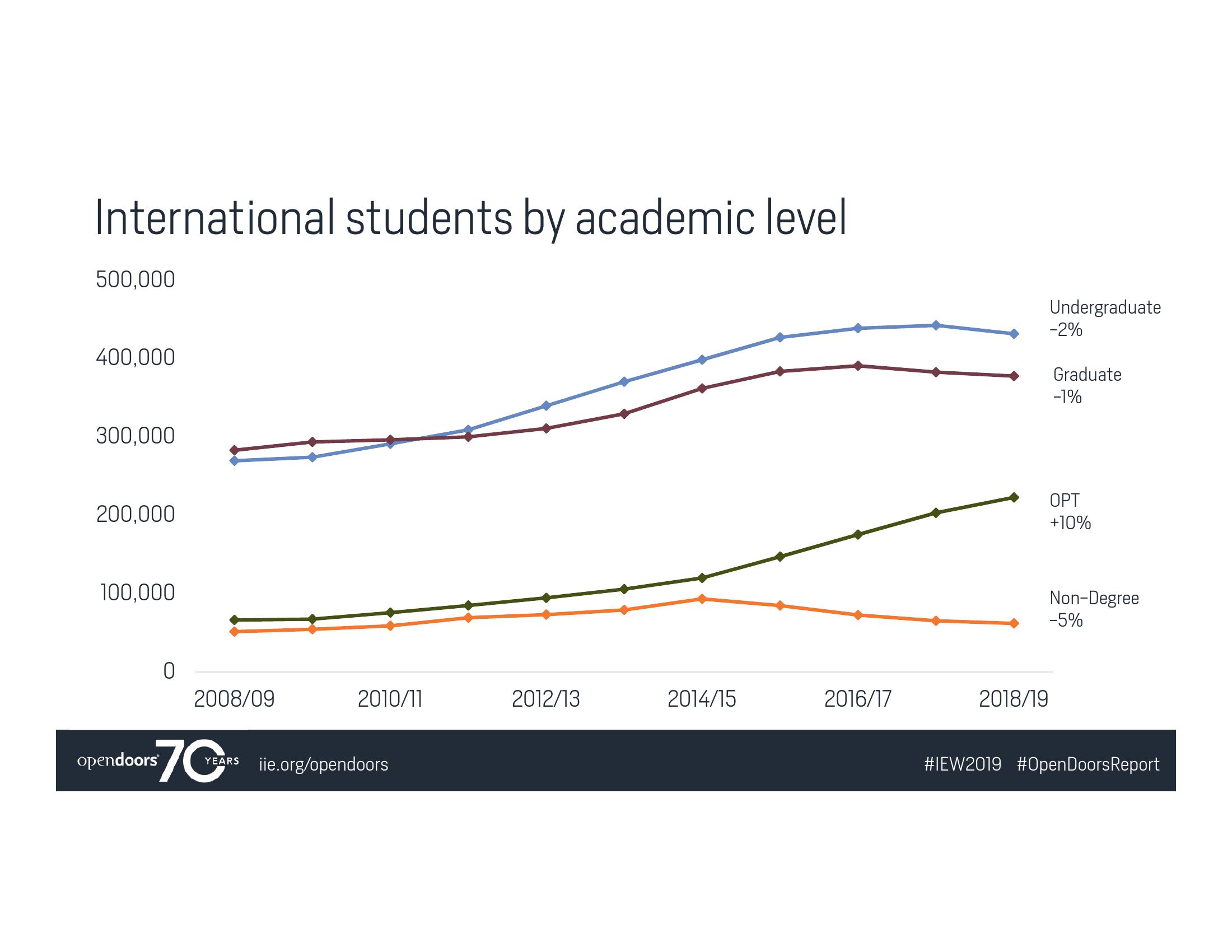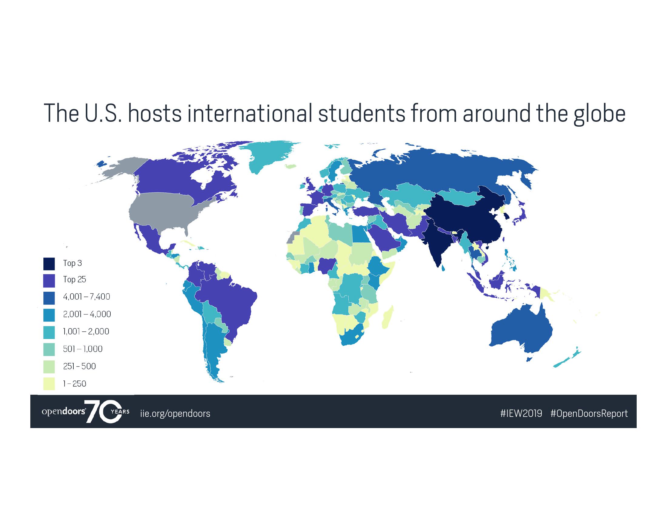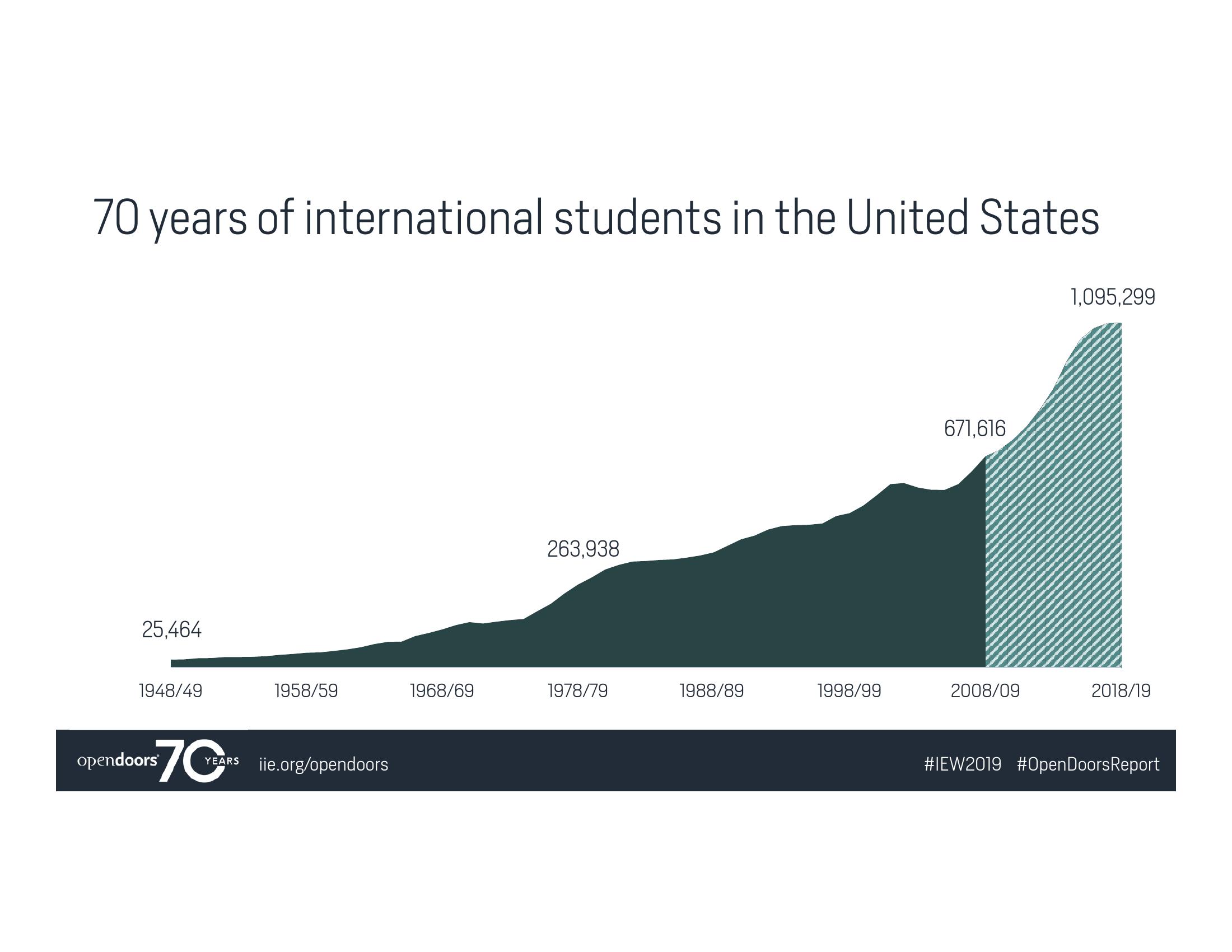 美国国际教育协会IIE发布了《2019美国门户开放报告》,该报告显示在2018——2019学年中,美国国际学生人数创历史新高,达到1095299人次,连续4年超过100万国际学生。