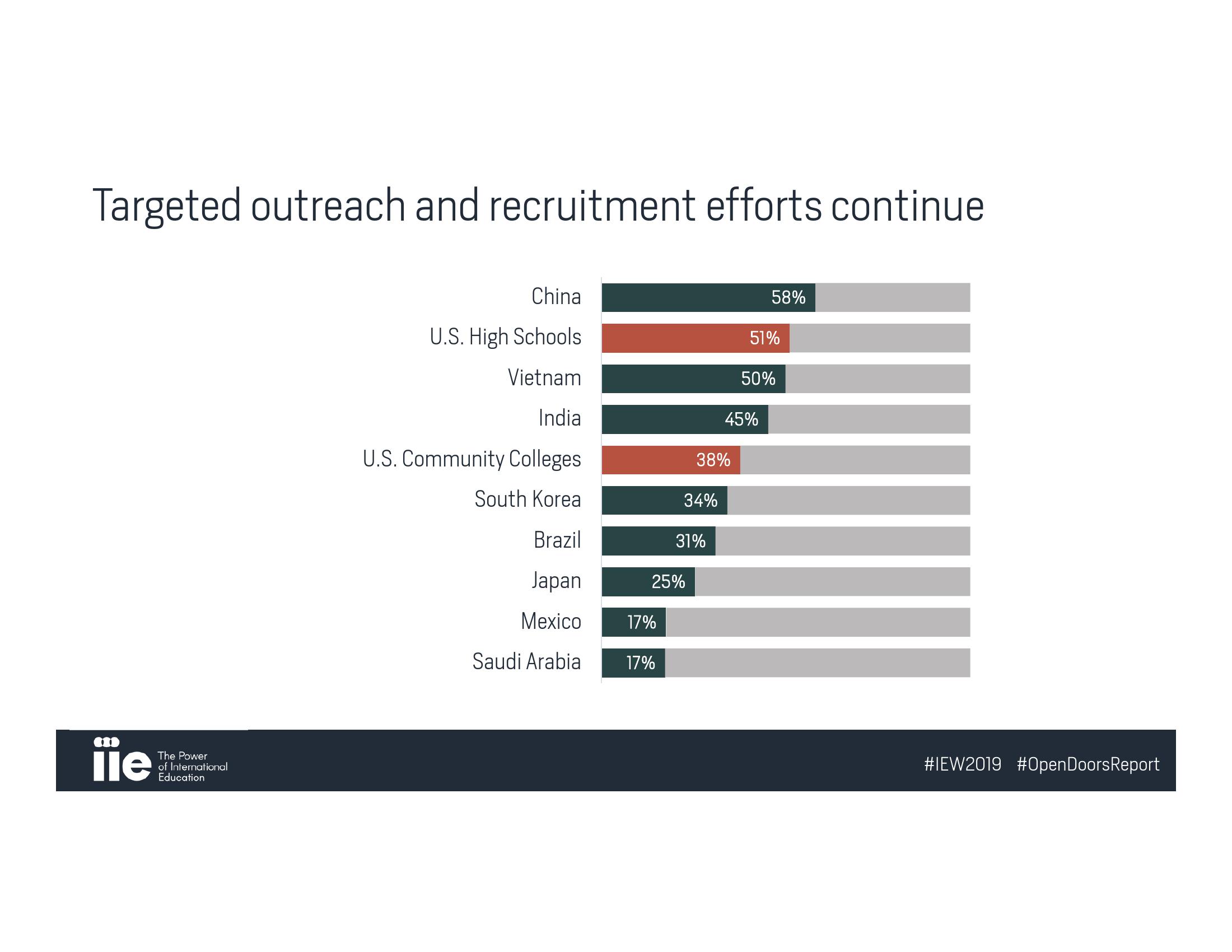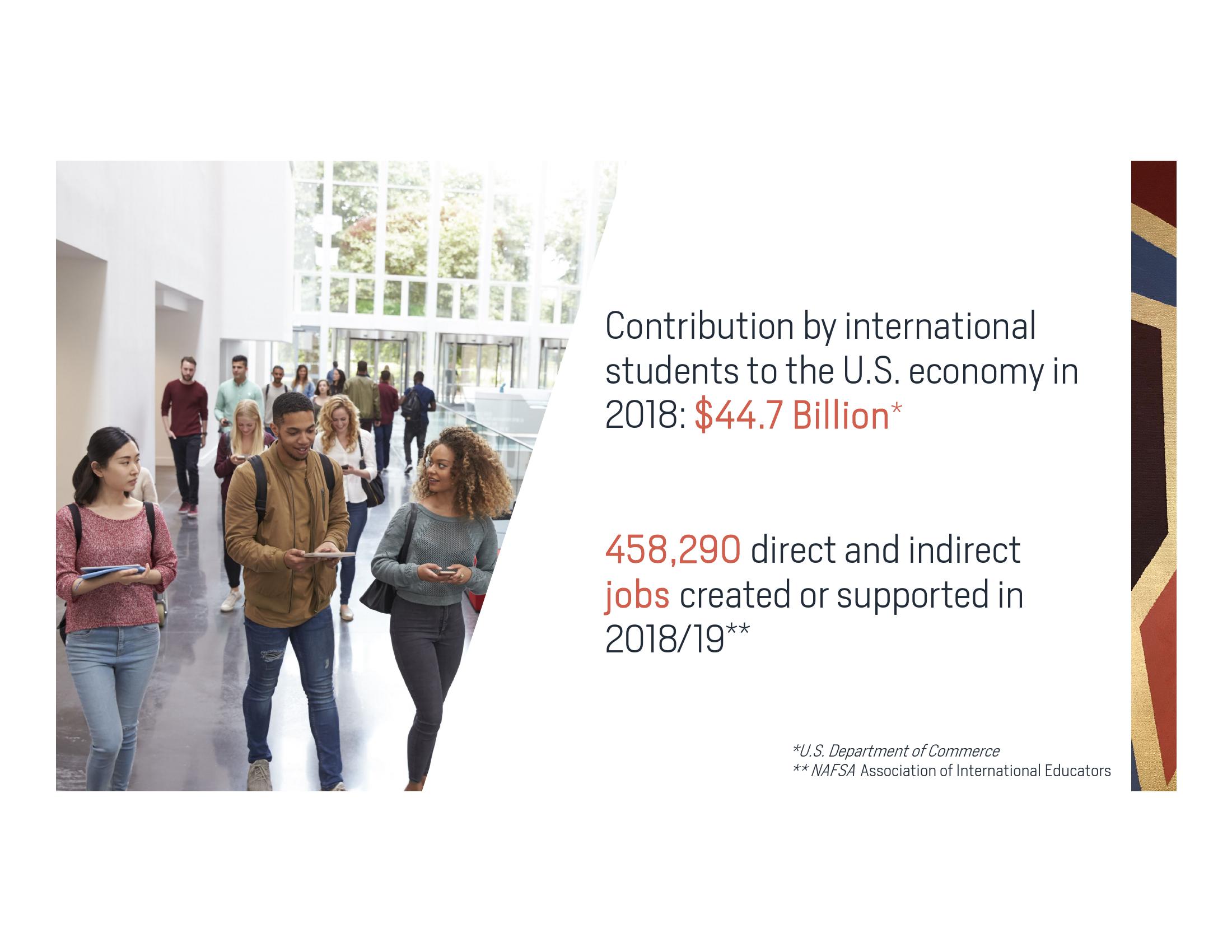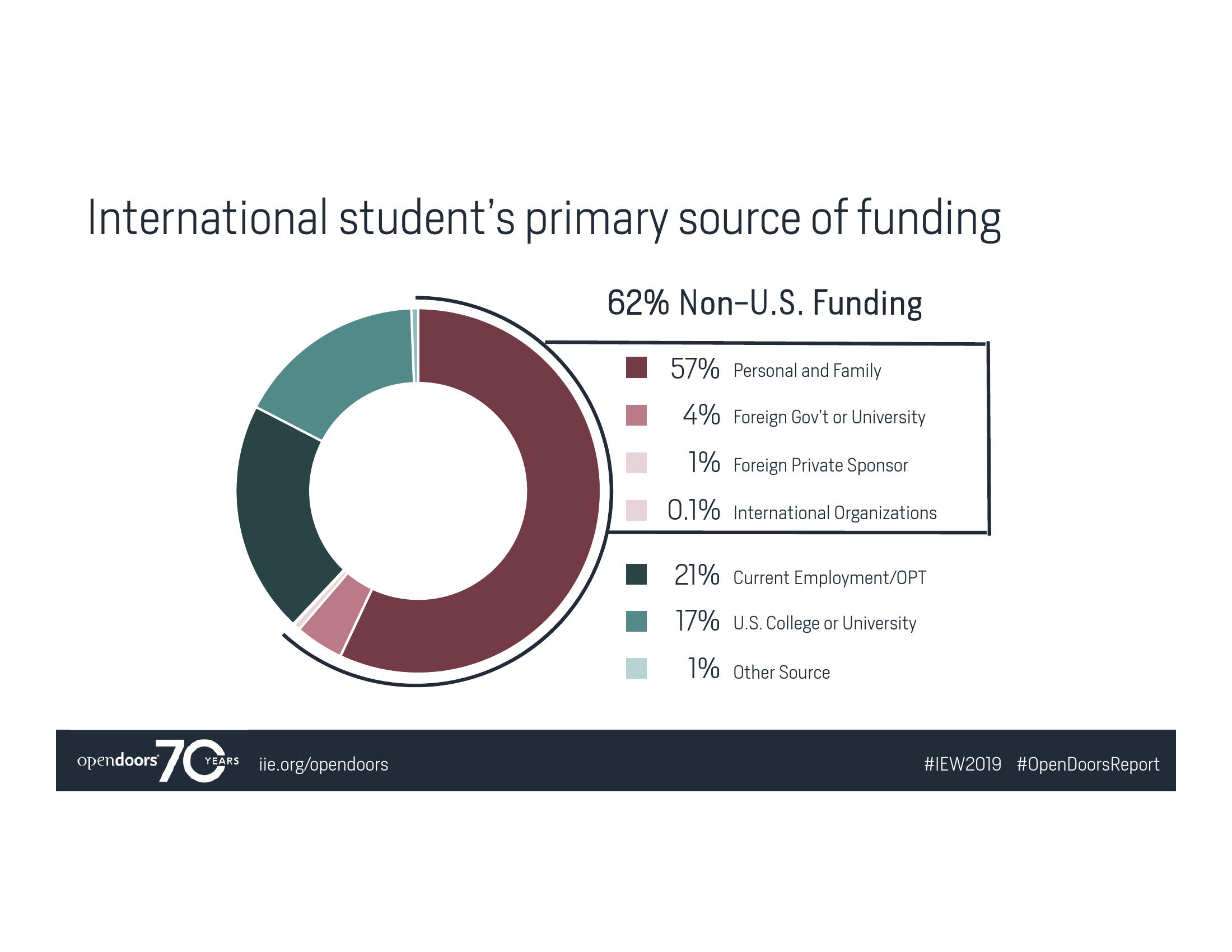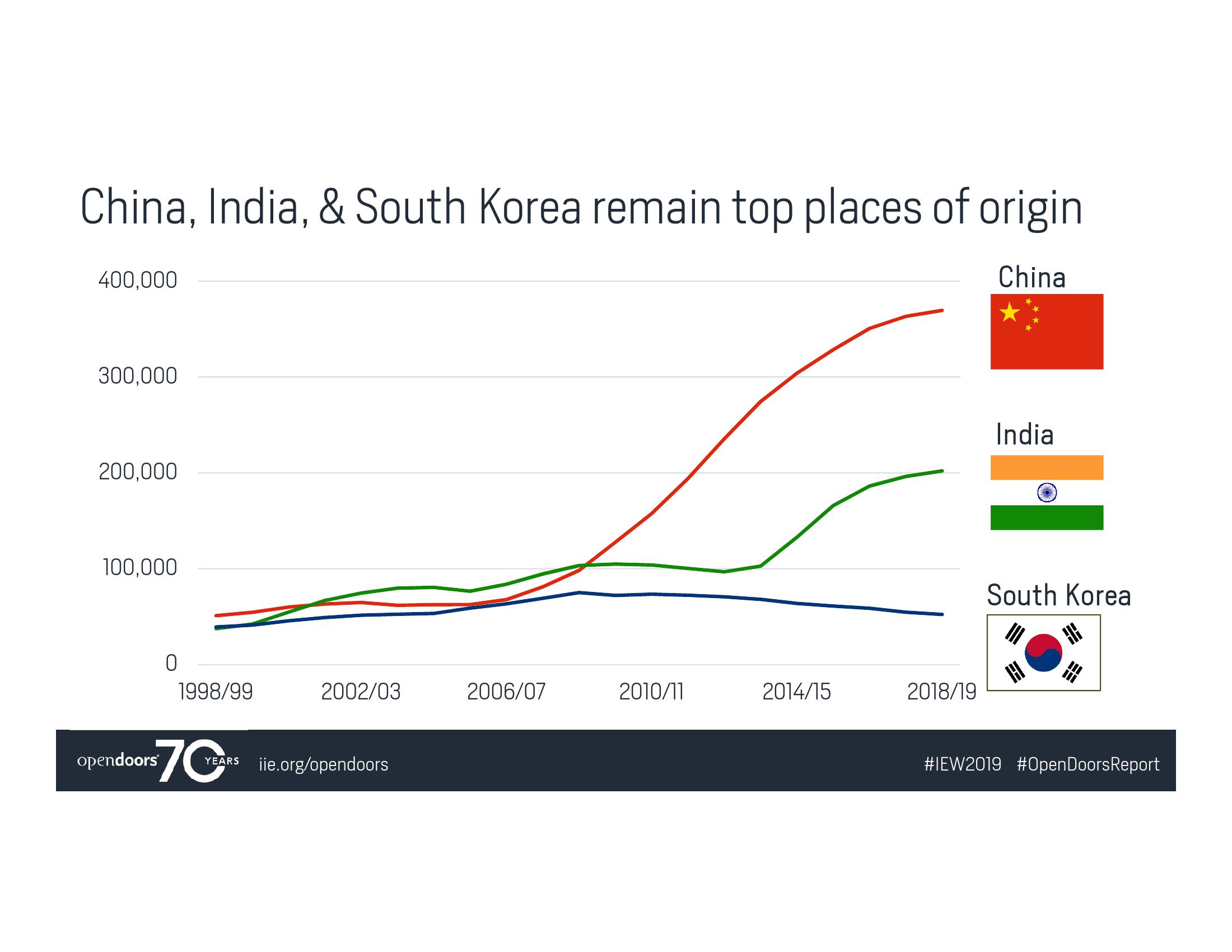根据《2019美国门户开放报告》,2018-2019学年,美国国际学生占美国高等教育总人口5.5%,而国际学生生源国数据则显示中国连续第10年成为最大生源国,在全部国际学生数中占比高达33.7%。此外,印度、韩国国际学生数量位列第二、三名。据悉,2018年国际学生为美国经济贡献了447亿美元收入。