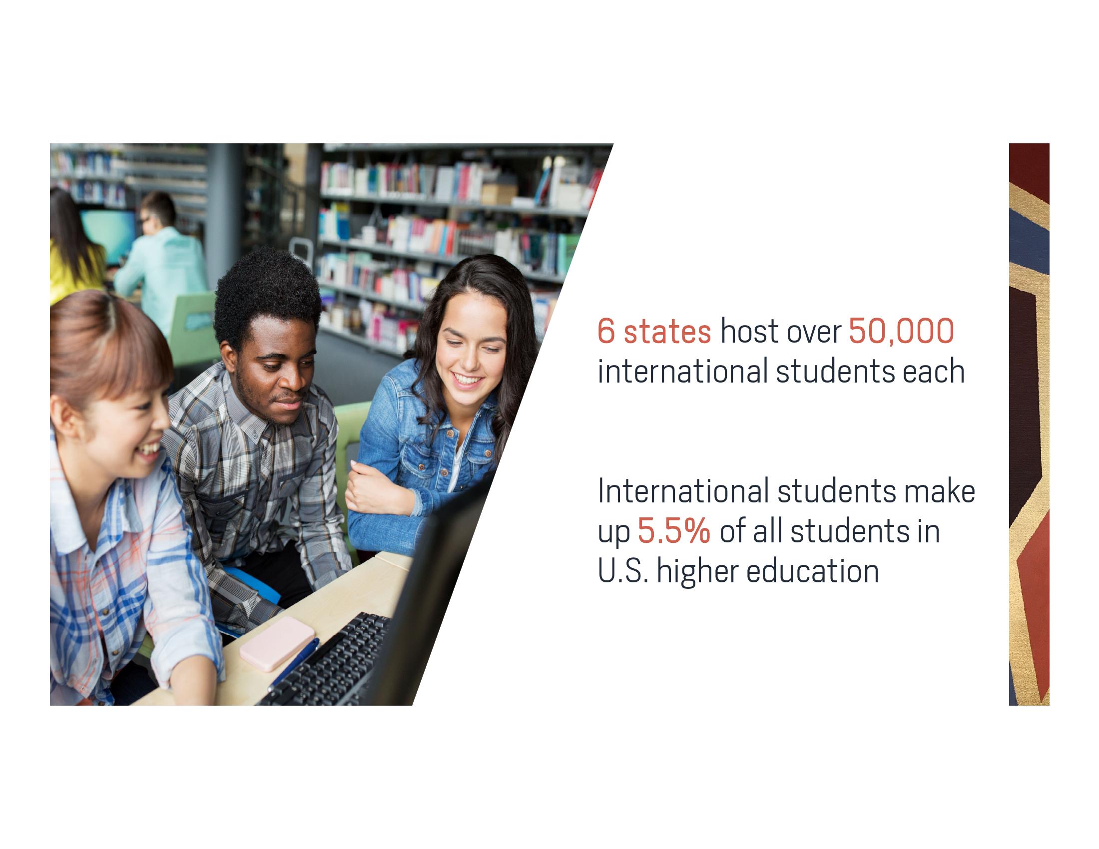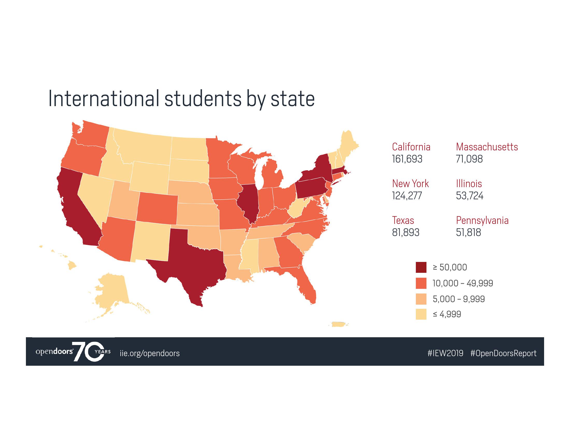 从地理分布来看,加州、纽约州、得克萨斯州成为最吸引留学生的三大地区,而拥有哈佛大学、麻省理工学院、波士顿学院的麻省则位列第四名。