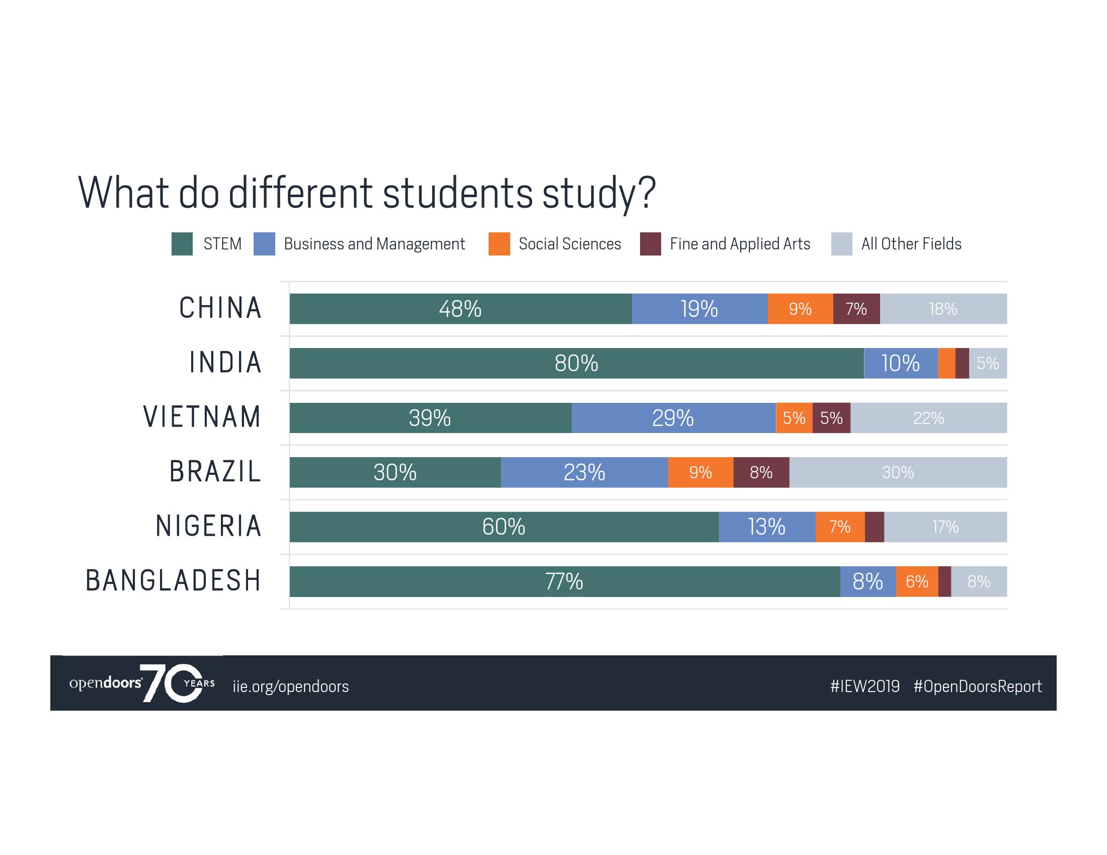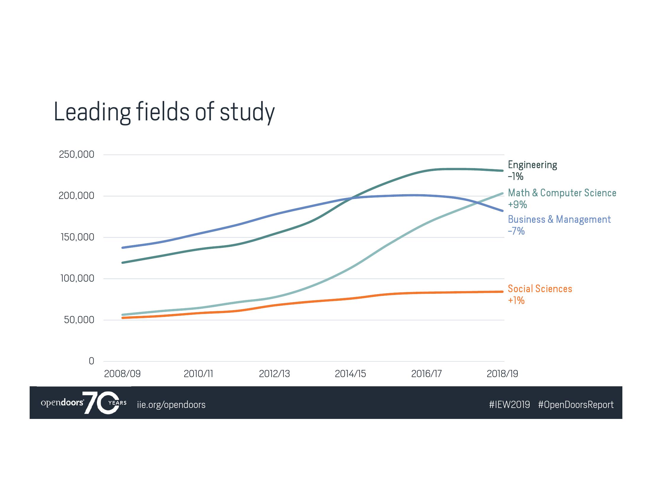 在留学专业选择方面,STEM相关专业如工程、数学、计算机科学等专业大受欢迎,而往年受欢迎的商科专业则同比去年下降了7.1%。中国留学生主要选择的方向主要为工程和商科。