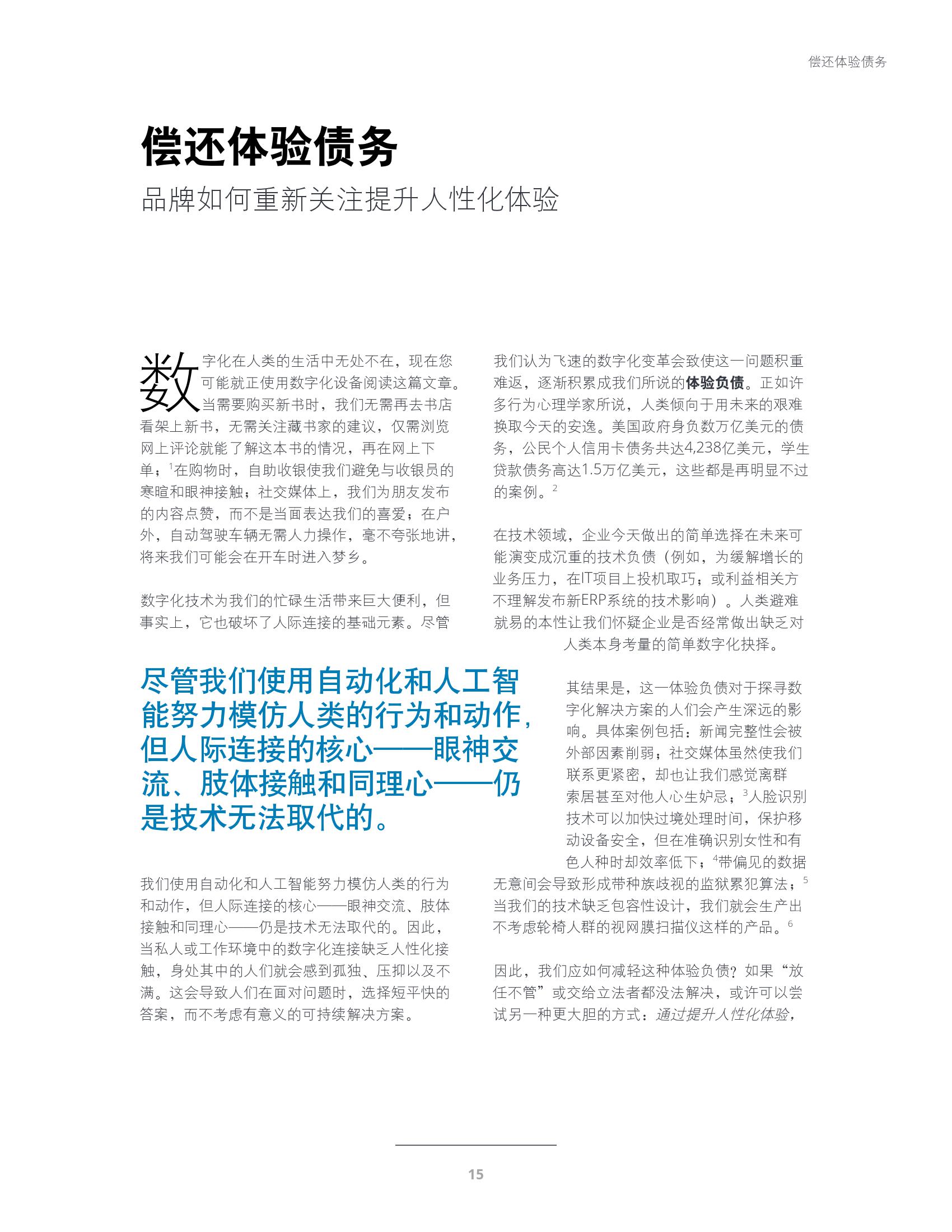 - 数字技术为消费者繁忙的生活带来便利,但同时也削弱了人与人之间的联系,在品牌和客户之间造成了一种“体验性债务”。