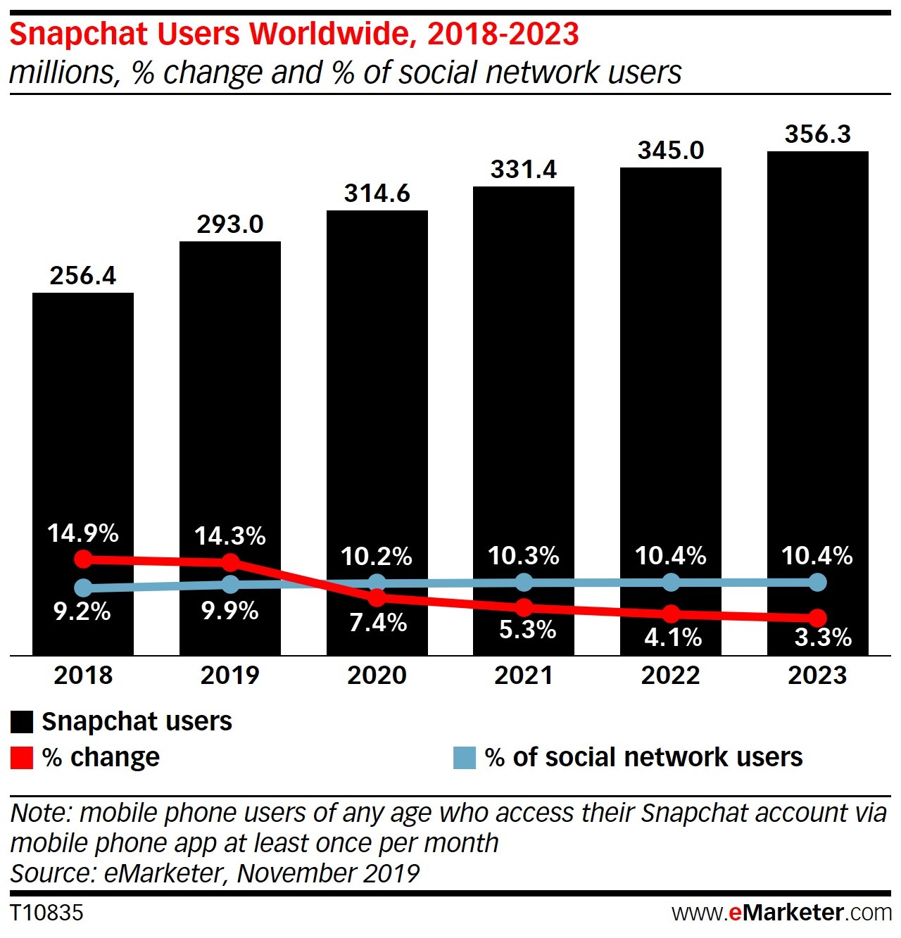 2017年末,Snapchat的重新设计导致一些美国用户离开了该平台,并抑制了其他方面的增长。但是,Snapchat正在卷土重来。新的功能和重建的Android平台给社交网络带来了新的动力。在对全球社交网络用户的最新预测中,eMarketer提高了对2019-2023年Snapchat用户数量的预测。