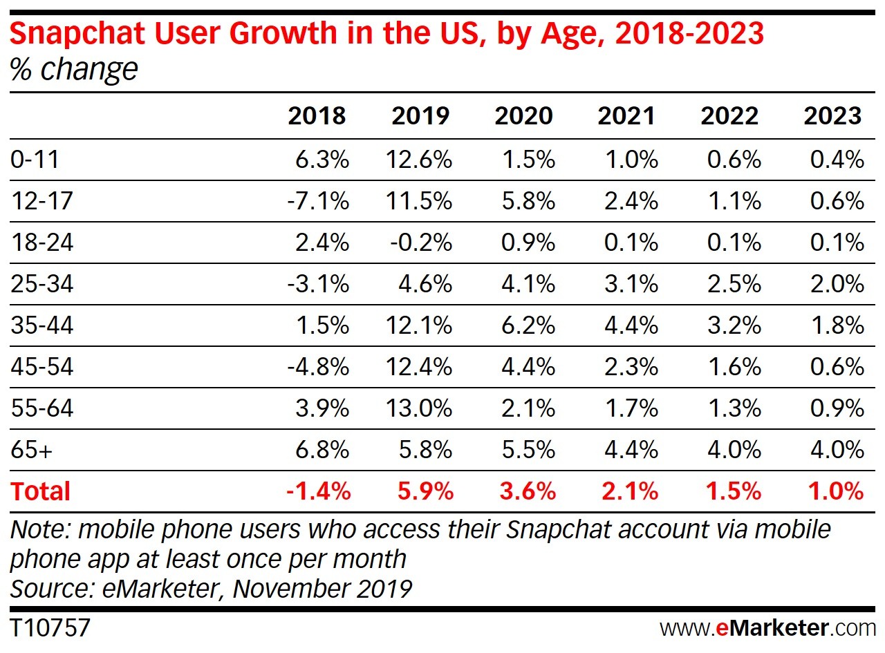年龄在35-64岁之间的用户数量呈两位数增长率,但基数很小。今年,Snapchat 8020万美国用户中只有1540万将属于这个年龄组。