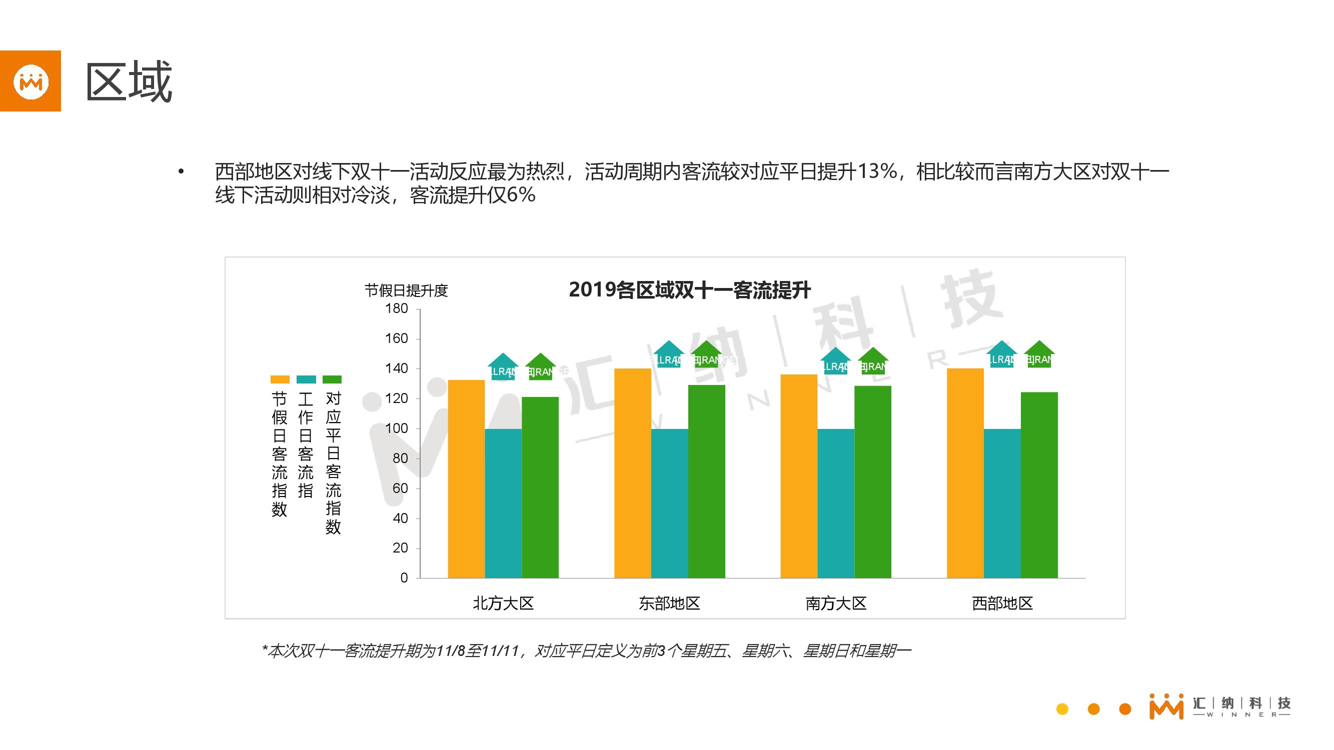 西部地区消费者对线下双十一活动反应最为热烈,活动周期内客流相较平日提升了13%,北方地区、东部地区双双提升9%,南方地区客流提升6%。