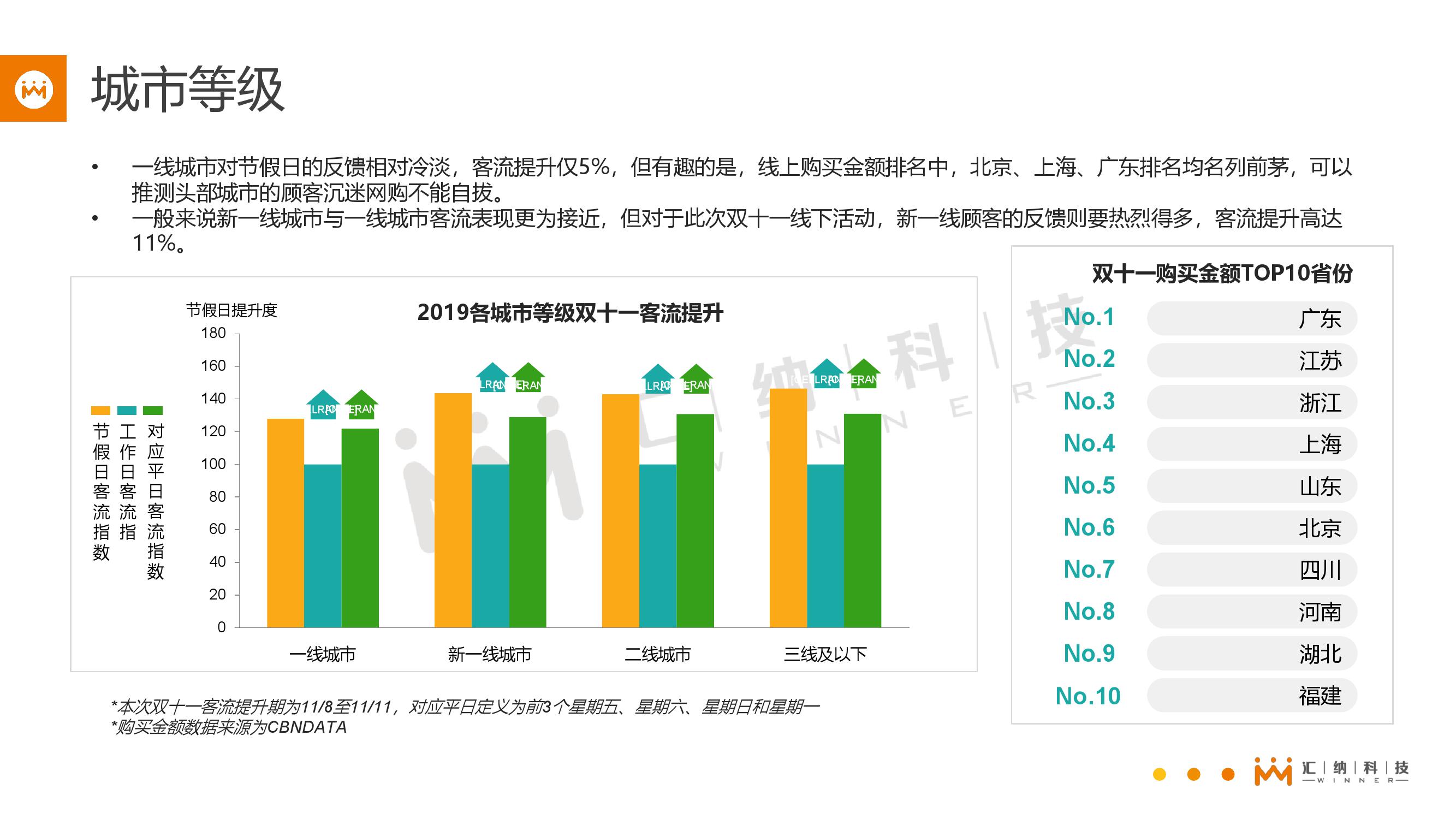 新一线城市线下消费热度持续领跑,今年双十一期间,新一线城市线下商场客流提升高达11%,而一线城市在双十一期间客流仅提升5%。