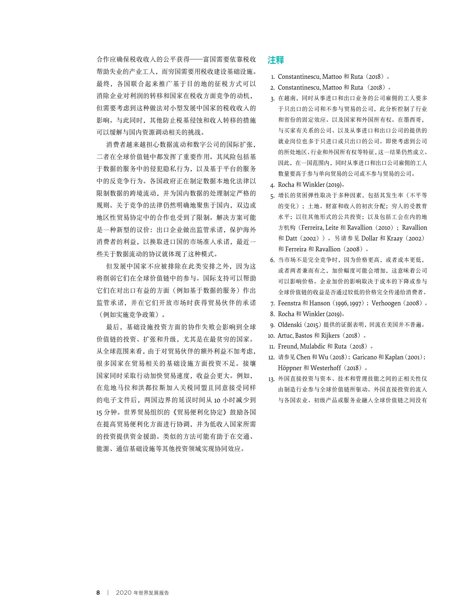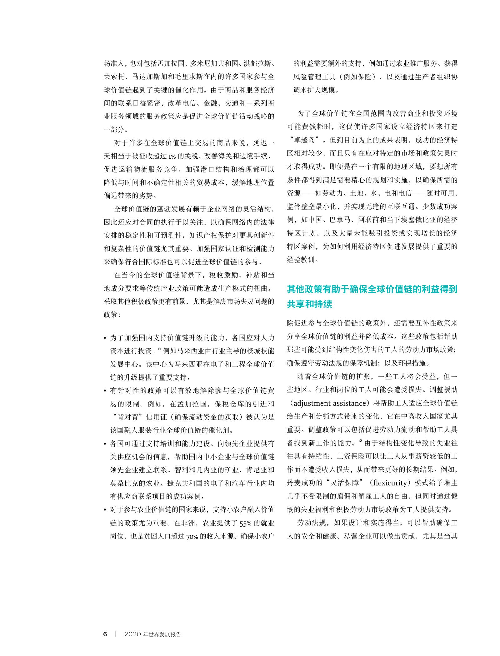 《2020年世界发展报告》特别说明了国家可以采取的吸引全球价值链投资的措施,即使他们在很大程度上被价值链革命排除在外也无妨。小措施——比如加快清关速度和减少边境延误——能给从大宗商品出口向基本制造业转型的国家带来大收益。对于许多在全球价值链中交易的商品来说,一天的延误就相当于加征超过1%的关税。此外,通过实现通信和公路、铁路、港口现代化以改善连通性的投资能够产生巨大效益。