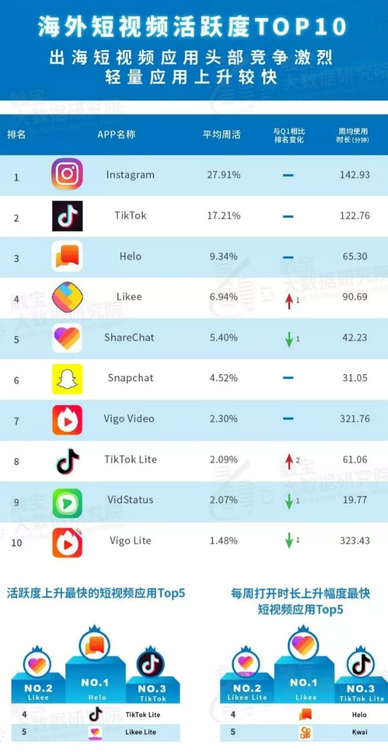 出海短视频应用头部竞争激烈,轻量版上升较快。