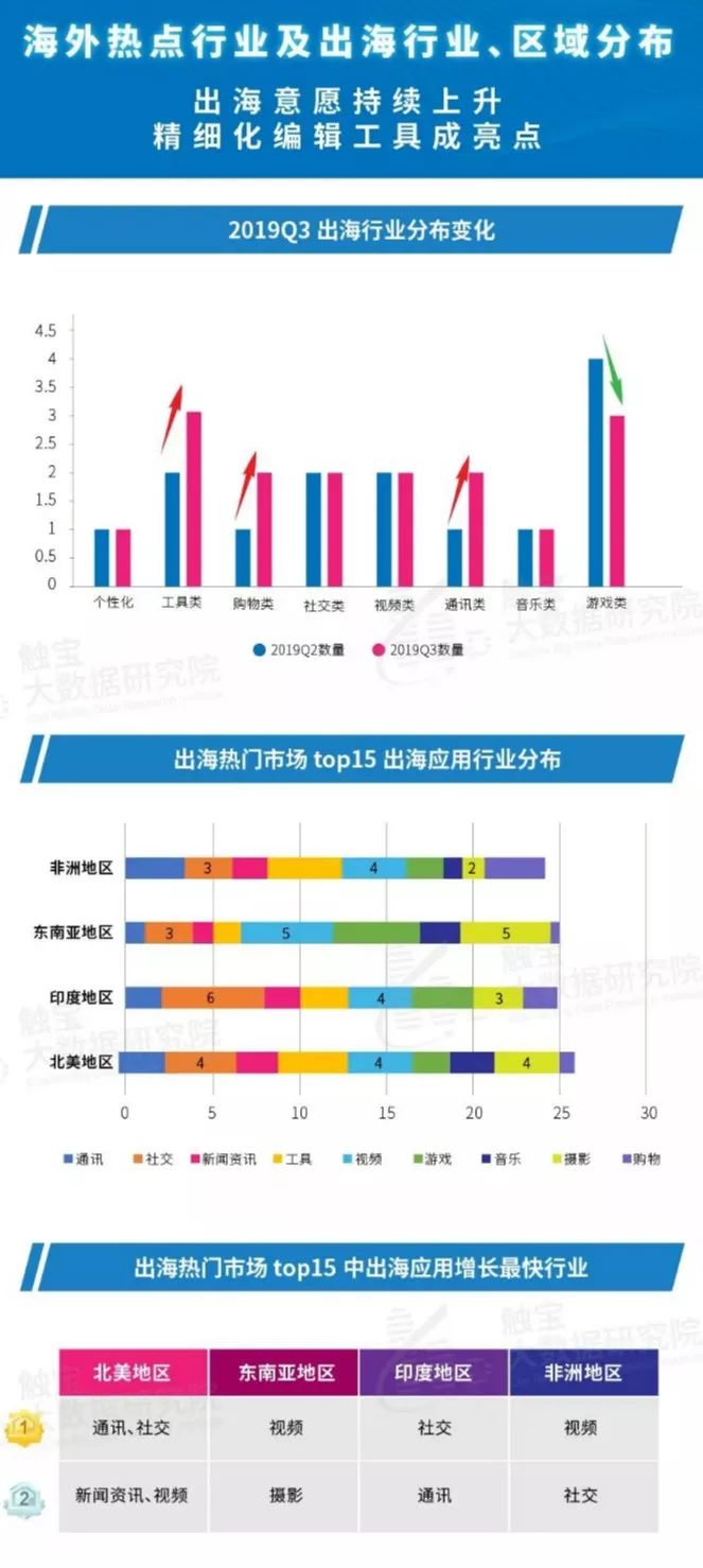 出海热门市场比起 Q2 又有回温,国内开发者在工具类和视频类中继续发力,在建立了短视频社交方式占领市场之后,开发者在不同市场进行本土化精细化运营,为用户提供更加智能的精细化工具,降低发布 UGC 的门槛,最高限度的提升用户参与度。