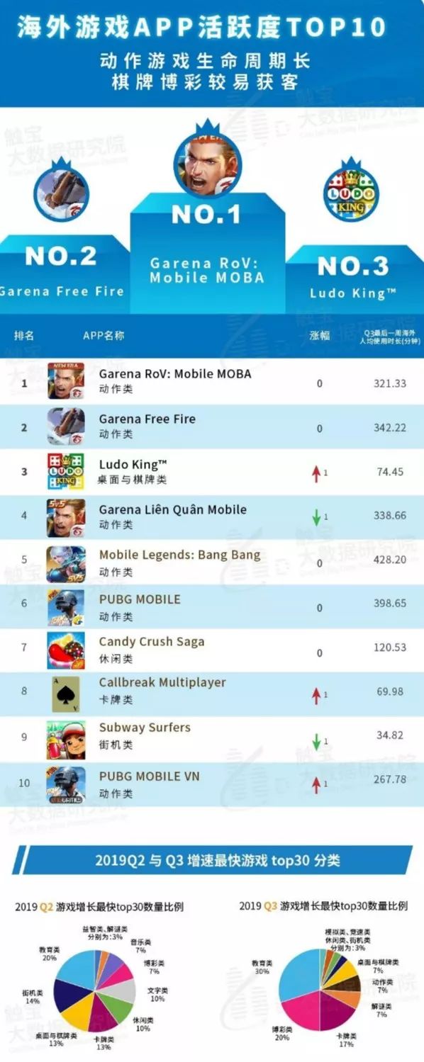 游戏类头部应用在一年之内都保持较大的优势,主要以游戏性较强,有社交因素的重度游戏为主,而超休闲游戏与棋牌游戏也各有巨头占据,但是相对而言动作类游戏即使是相似玩法也仍能保持更长时间在榜。在 Q3 博彩类与卡牌类游戏的活跃度快速增长,这类游戏制作周期短 ARPU 高,对于开发者而言选择可选择合适区域进行切入。