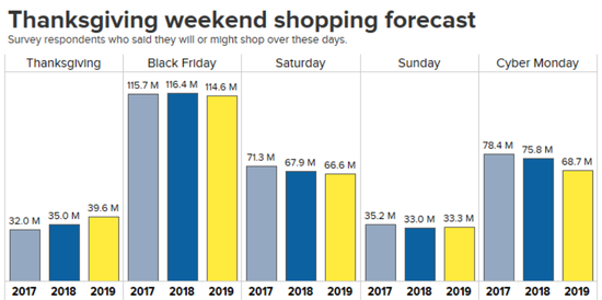 根据美国国家零售联合会(National Retail Federation)的数据,“黑色星期五”将是美国大的购物日。在“黑色星期五”及随后的周末,预计将有1.65亿人加入购物大潮。