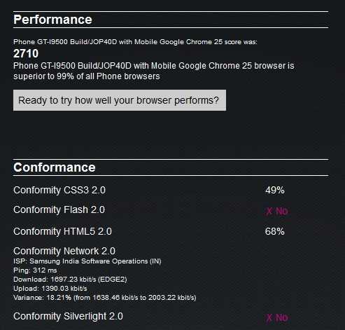 随着三星正式敲定3月14日召开Galaxy S IV发布会,关于设备的相关信息也纷纷开始曝光,除了今天曝光的在黑暗中的朦胧照之外,国外评测网站Rightware的Browsermark 2.0(一个跨平台的浏览器评测工具)数据库也出现了型号为GT-i9500的跑分图,总成绩为2710分,固件版本号为Build/JOP40D,称所搭载的移动Google Chrome 25浏览器打败全球99%移动浏览器。