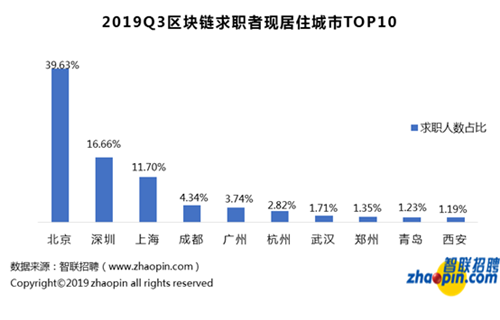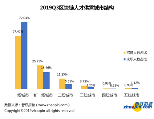 从2019年第三季度区块链招聘需求的城市分布来看,人才需求主要集中于一线和新一线城市,与人才求职城市分布对应,且人才供给明显更集中在一线城市。