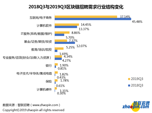从行业分布看,2019年三季度,互联网/电子商务和计算机软件行业对区块链人才的招聘需求占所有行业的比例分别为37.14%和14.45%,占需求主流。需求前十的行业还包括IT服务、基金/证券/期货/投资、教育/培训/院校等。