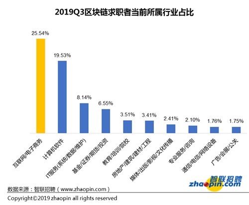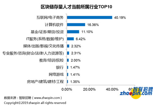 1. 区块链存量人才主要分布于互联网/电子商务行业,与区块链底层技术逻辑相呼应