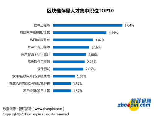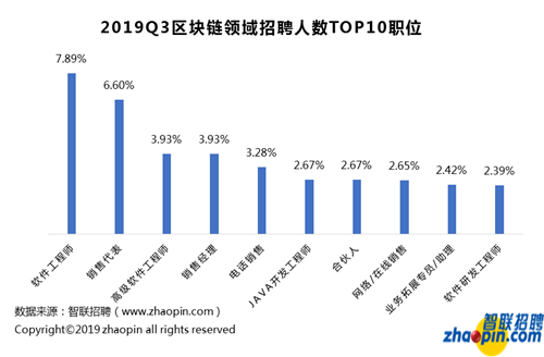 随着大家对区块链的认识深入,作为底层技术的区块链,其发展空间来自于与各行各业的应用融合。虽然行业整体降温,但对于真正将区块链技术或产品作为核心业务的企业,技术人才和销售人才都是不可或缺的,在招聘需求中,软件工程师是需求最多的岗位,占比7.89%。其次是销售代表,占比6.6%;高级软件工程师占比3.93%,可见技术类岗位首当其冲是企业揽才的第一目标,其次是帮助公司实现盈利的销售团队。