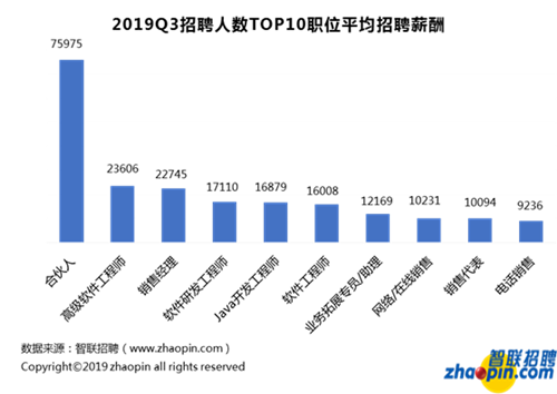 智联招聘大数据显示,区块链招聘人数数量TOP10职位中,热门岗位软件工程师平均招聘薪酬为16008元/月;销售代表平均招聘薪酬10094元/月;高级软件工程师平均招聘薪酬23606元/月。其中合伙人平均招聘薪酬最高,为75975元/月,位居薪酬榜首。除此之外,其他高薪岗位多为高级专业技术岗,值得注意的是销售岗等通用岗位也开始成为行业高薪聘请岗位。
