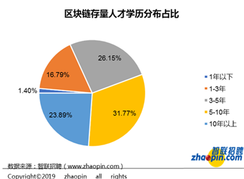 区块链存量人才中,5-10年工作经验者达31.77%,10年以上工作经验者占比23.89%,其次是3-5年工作经验者占26.15%,1-3年16.79%,1年以下占比1.40%。可见,存量市场人才相对经验丰富,与之相对应的其在职位选择也应该会更加精准、慎重。