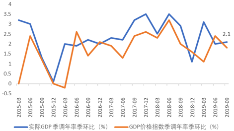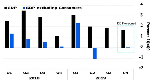 注释:黑色为GDP季度增速,蓝色为除去消费者的GDP季度增速,浅蓝色框为经济学家对2019年Q4的预测。