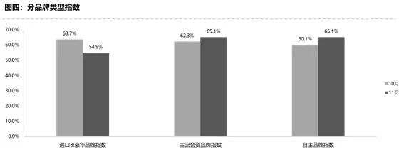 从分品牌类型指数看:2019年11月进口&豪华品牌指数54.9%,环比下降8.8个百分点,主流合资品牌指数、自主品牌指数较上月上升。