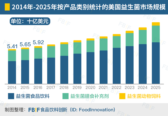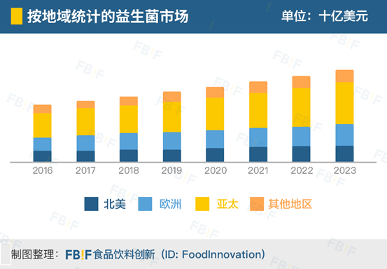 Acumen Research and Consulting 6月的一份报告预测,到2026年,益生菌市场价值将达780亿美元左右。除了常规的益生菌乳品,其他益生菌品类也有很多创新进展。我们观察到,在国际市场,除了常规的乳品,益生菌还有很多创新的“妙用”,比如益生菌果汁、巧克力、饼干、泡芙等。比如Qwrkee(Vishal Madhu英国初创植物基品牌)8月份就推出一款益生菌零食Qwrkee泡芙。它由豌豆蛋白、蚕豆和高粱三种主要成分制作而成,每100克“泡芙”含有50亿益生菌。它利用高新科技使泡芙在200℃高温的制作过程中依旧保持益生菌活性。在十月左右,有机品牌Purella Super Foods推出的益生菌饼干,包含多达100亿个GBI-30天然菌株,可提高免疫和消化系统。相比之下,我国的益生菌食品似乎缺少了“想象力”,发酵乳制品就占了益生菌整体市场的78.4%。[2]我们不妨“舍近求远”,从国外那些益生菌创新食品上找找灵感。全球益生菌市场将达4000亿元,了解市场才能下好这盘大棋随着人们的食品健康意识的增强,全球益生菌市场显著增长。2018年发表于Allied Market Research上的Probiotic Market report预计全球益生菌市场2022年将达到574亿美元(约4037亿人民币),2016年到2022年期间年复合增长率为7.7%。[3]益生菌不仅可以提高食品整体风味,还有助于消化健康,越来越多地以一种补充成分的形式出现在食品和饮料之中。信息来源:markets and markets按照市场咨询公司Grand View Research的分类,益生菌市场可分为三个类别:益生菌食品饮料、益生菌膳食补充剂和益生菌动物饲料。益生菌食品饮料可进一步分为乳制品、非乳制品、谷物、烘焙食品、发酵肉和干燥益生菌食品。膳食补充剂分为食品补充剂、营养补充剂、特种营养素和婴儿配方食品。[4]在应用方面,由于益生菌功能性食品和饮料在消费者中日益普及,食品饮料市场主导了整个益生菌市场,有望成为最大的创收来源。预计在2018年到2023年内,食品饮料领域将占据全球益生菌市场上的主要位置。[1]信息来源:grand view research在地域分布方面,我们看到亚太地区的消费者非常了解益生菌健康方面的益处。中国和日本是该地区最大的益生菌市场,而澳大利亚和新西兰市场是增长最快的区域,复合年增长率为13.3%。由于亚太各国政府越来越关注农场动物的健康状况和产量,动物性益生菌产品也面临巨大机会,尤其是益生菌饲料。信息来源:markets and markets再来看国内益生菌市场。2017年,我国益生菌行业市场规模达460亿元,预计到2022年将增长至896亿元,年平均增速约14%,处于快速增长期。目前国内上游原料由美国杜邦、丹麦科汉森等少数企业垄断,下游产业应用场景广泛。[5]从品类看,膳食补充剂的高端品牌有纽曼思、合生元、中益企业、昂立一号等,它们多选用进口菌株。[6]食品饮料领域,益生菌主要运用于酸奶、乳酸菌饮料等乳制品和益生菌溶豆、软糖等,口味区分度不大,零食和其他饮料品类尚存缺口。从面向人群和功效来看,除了老少咸宜的乳制品,益生菌其他食品目前主要面向婴幼儿和儿童,功效以助消化、补充营养为主。随着社会发展,亚健康人群、中老年人群会持续增加,益生菌食品面临巨大的市场机会。
