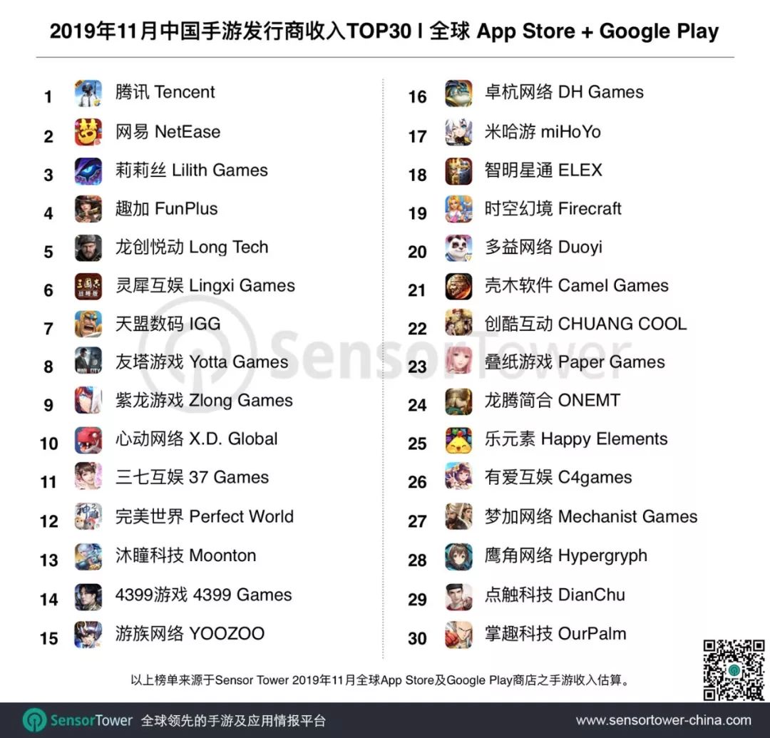 Sensor Tower 商店情报平台显示,2019年11月中国手游发行商在全球 App Store 和 Google Play 的收入排名。榜单中30个手游发行商11月全球吸金超过13.7亿美元,占当期全球手游总收入28.2%。详细榜单变化如下。