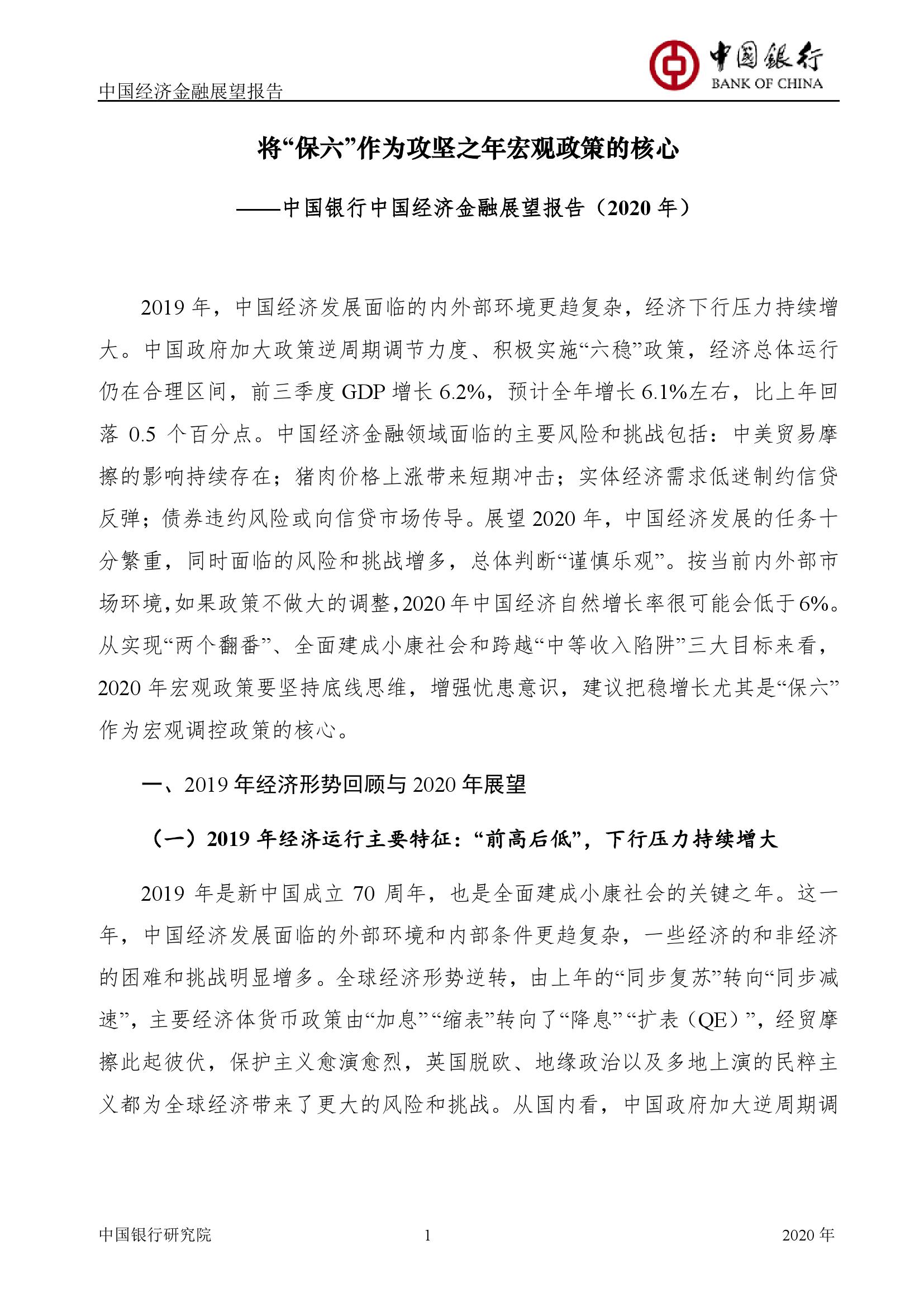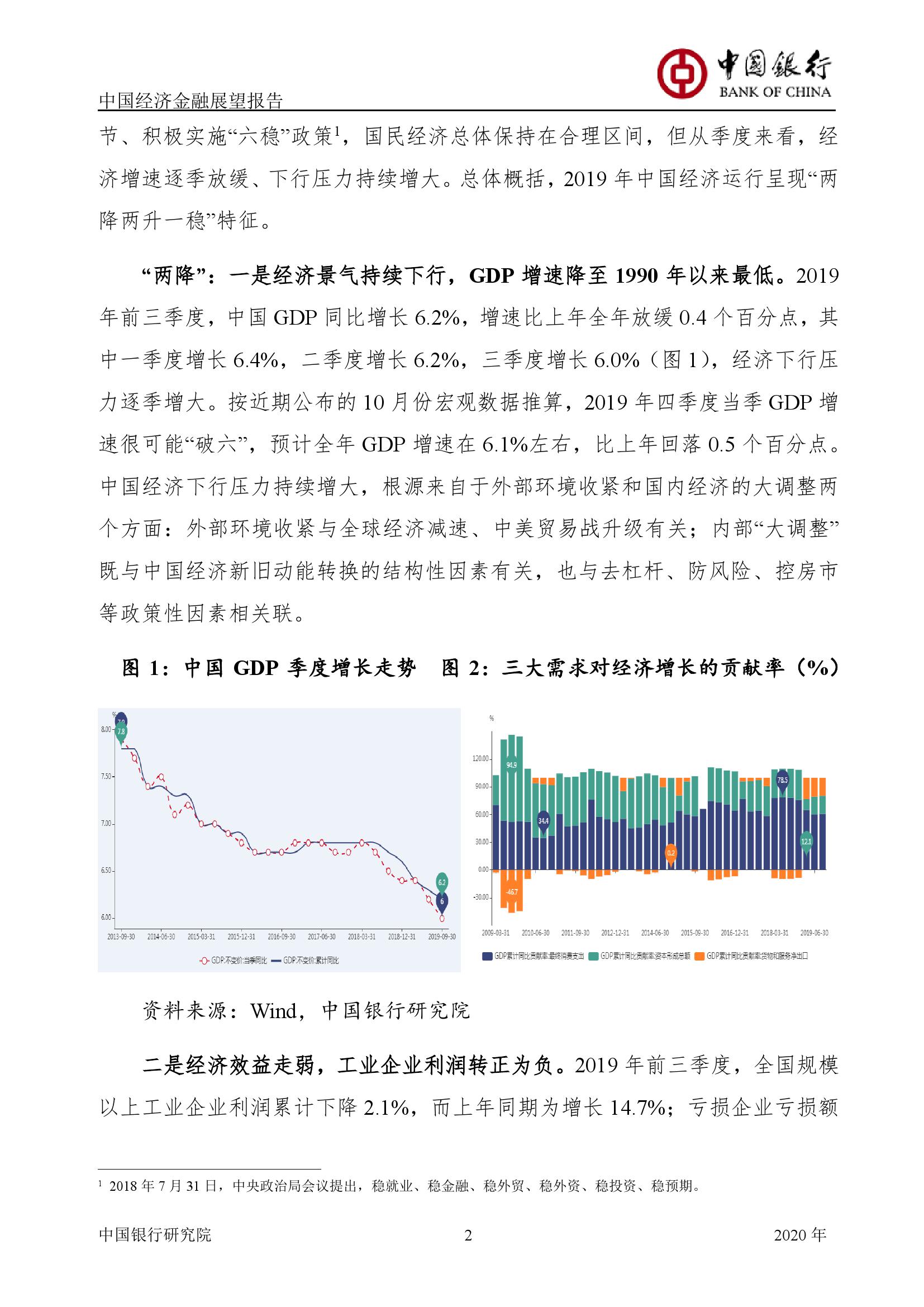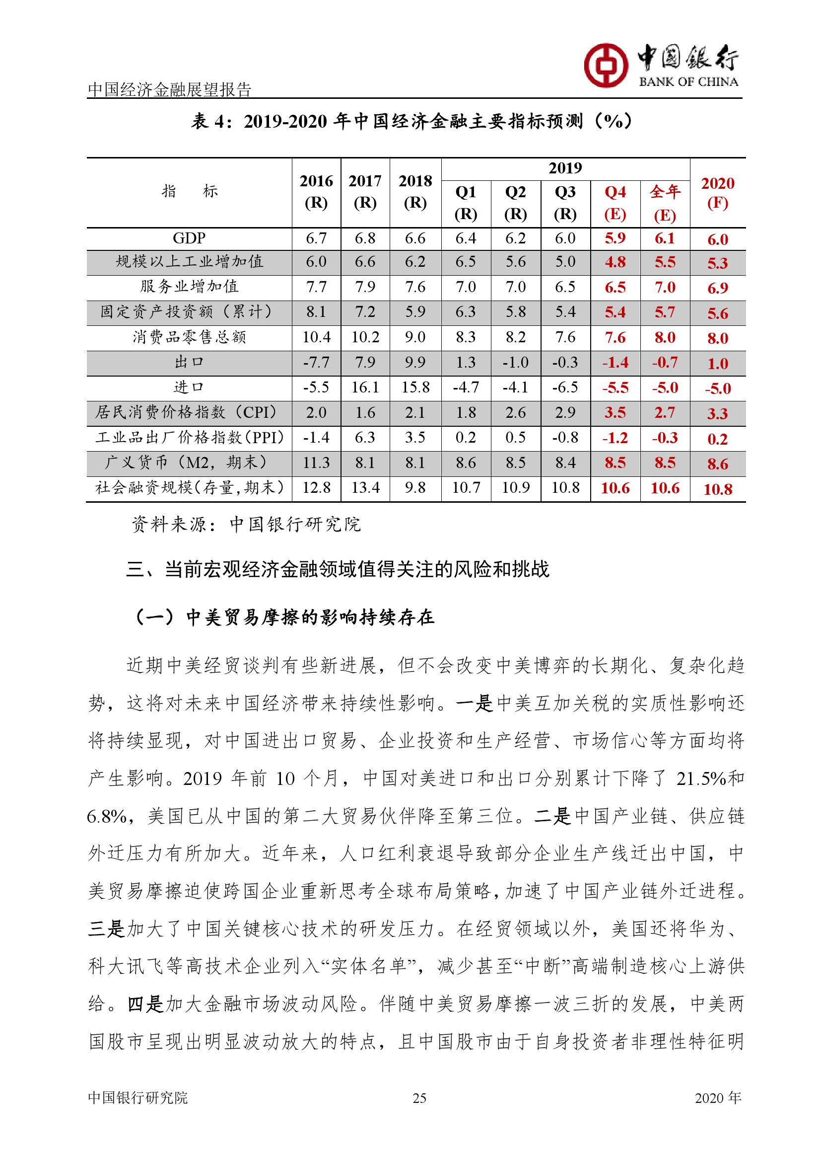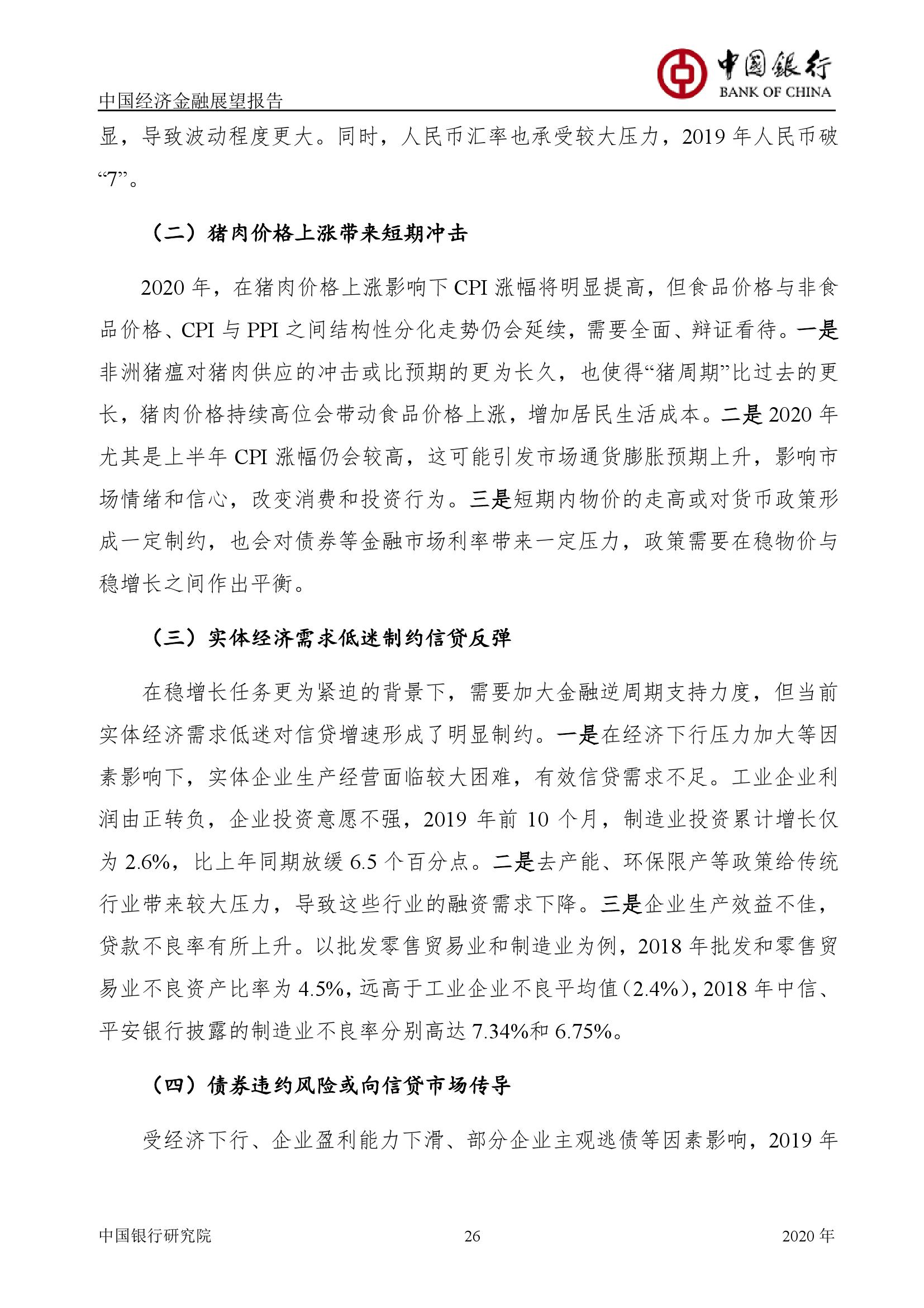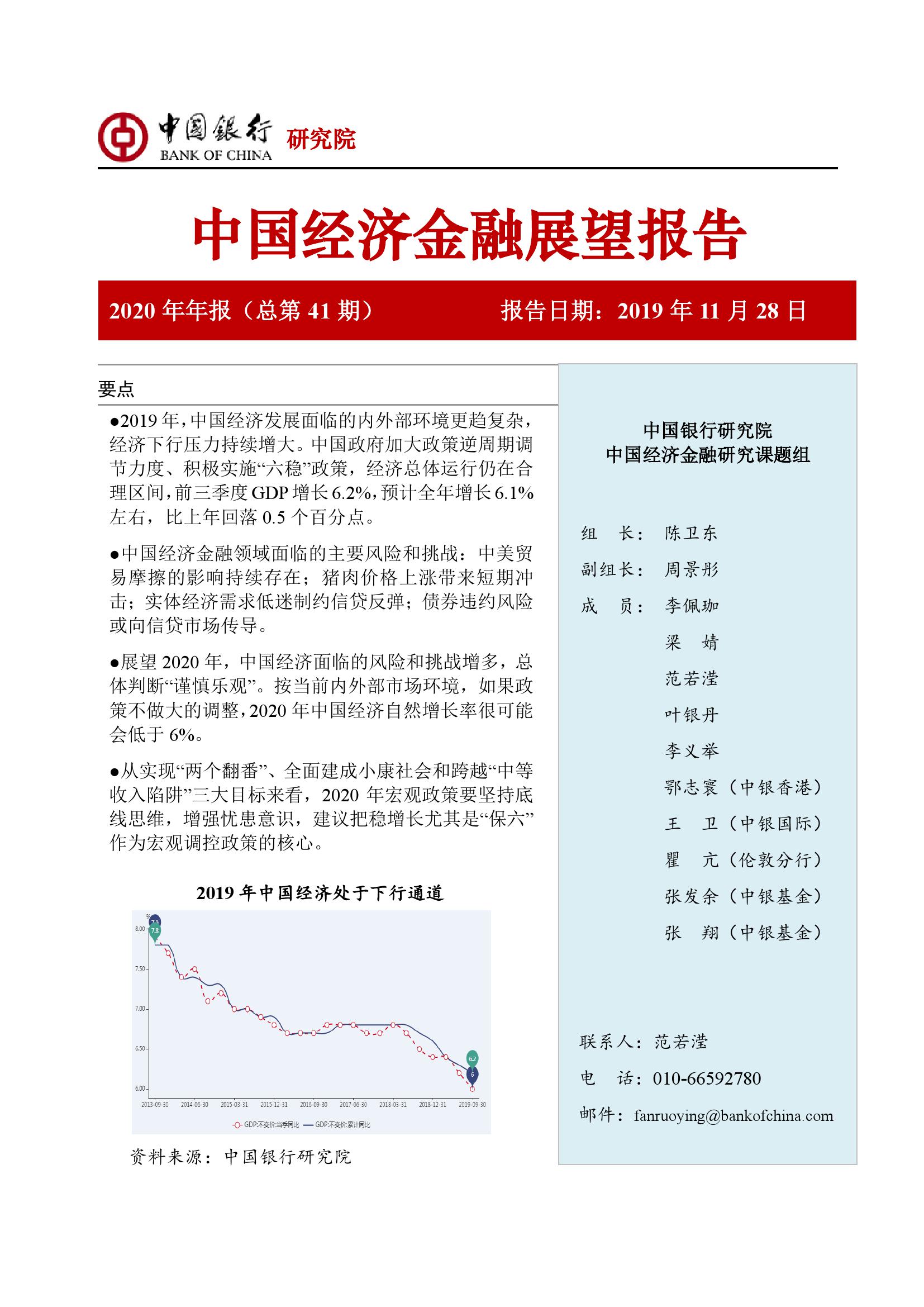 中国经济金融主要面临中美贸易摩擦、猪肉价格上涨、实体经济需求低迷、债券违约风险或向信贷市场传导等风险。展望2020年,中国经济面临的风险和挑战增多,总体判断“谨慎乐观”。按当前内外部市场环境,若政策不做大的调整,2020年中国经济自然增长率很可能会低于6%。